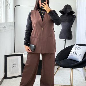 Ensemble Blazer Sans Manches Ouvert au Dos et Pantalon Marron