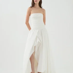 Whistler – Robe longue chiffon blanc décolleté bandeau et froncée
