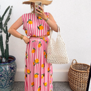ENSEMBLE LINI Top et jupe à motifs rayures et citrons, rose ou bleu