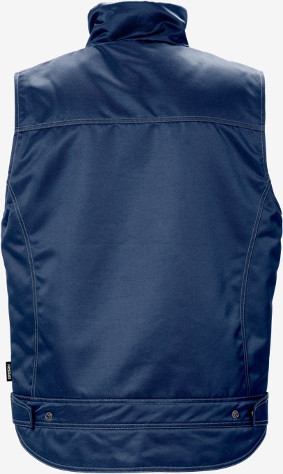 Vest met fiberbontvoering van waterafstotend materiaal. De rits aan de voorkant en de knopen zijn bedekt voor bescherming tegen krassen en het vest heeft een verlengd rugpand.