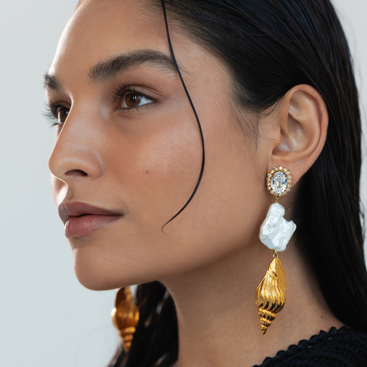The jaw-dropping Adella Earrings harness the power and divine femininity of the sea, creating a masterpiece of an accessory. The golden conch shells dangle from halo-set faceted crystals, and luminous freshwater baroque pearls, which we love for their magical iridescence. These earrings have the most graceful motion, like the ocean’s undulating waves. Dimensions: 4.25 inch length