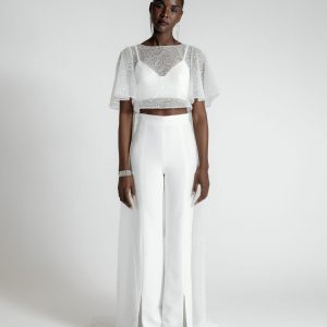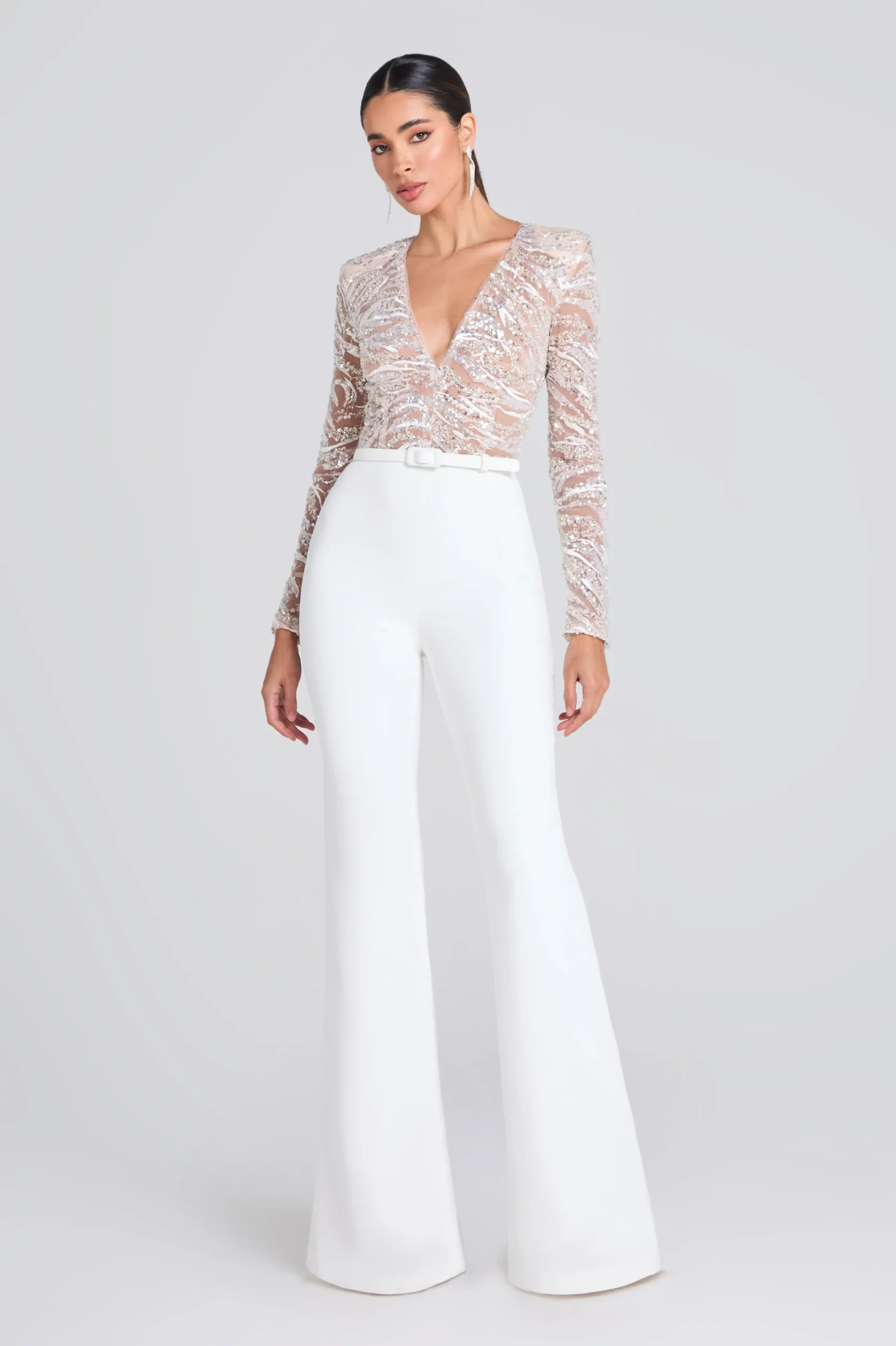 Bridal season is here, celebrate with our ALEXA White Jumpsuit. This white sequin flared jumpsuit is designed for the modern bride seeking a refined reception look with a contemporary flair. Featuring an embellished beaded sequin bodice with a sultry low neckline and luxurious crepe flared trousers for a figure-hugging fit, this mesmerising piece is a show-stopper with or without the waist belt.