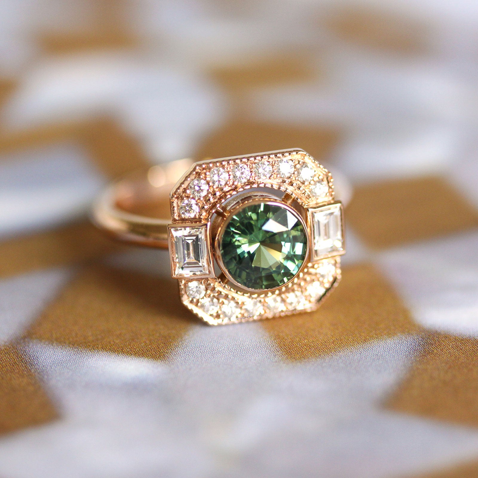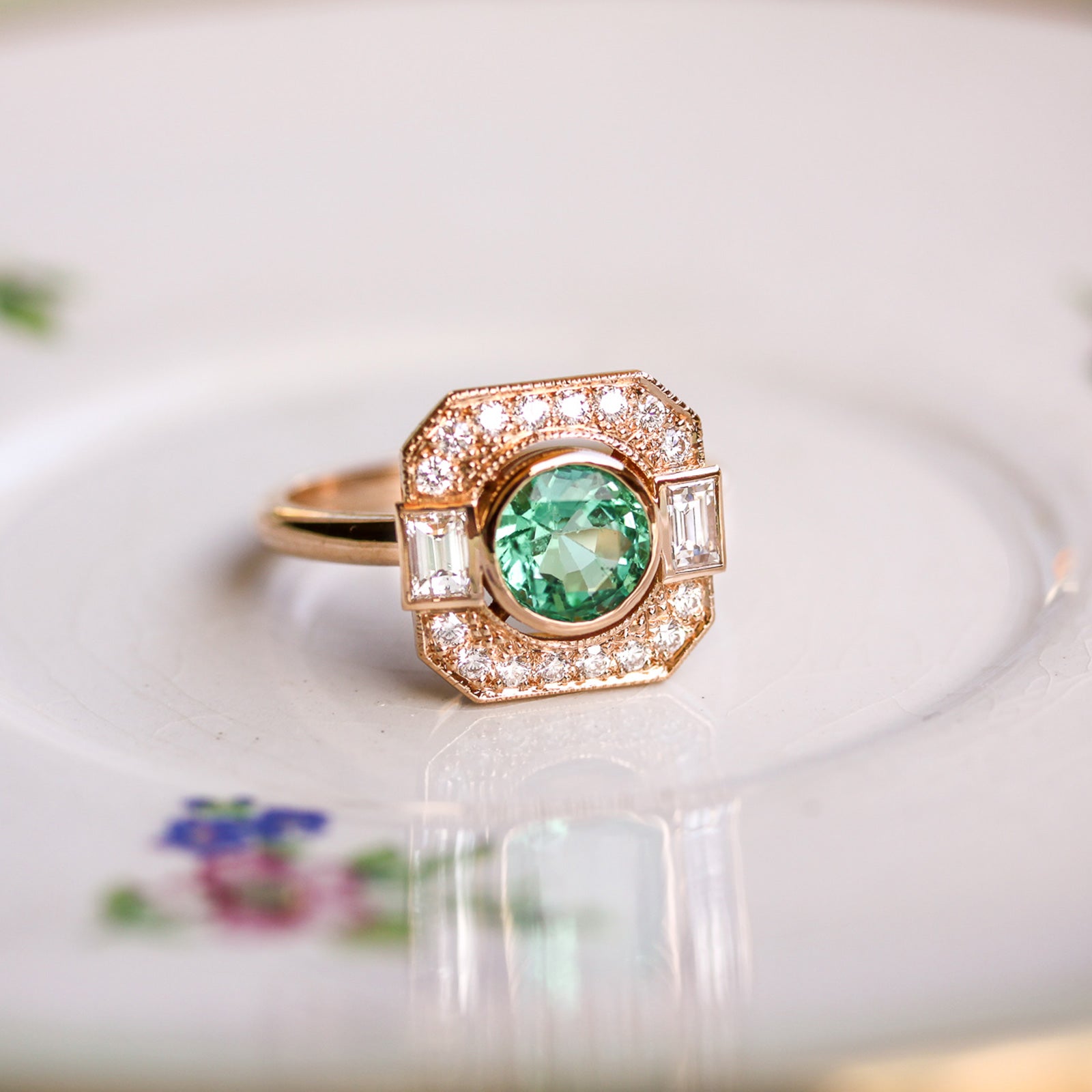 La bague Café de Paris en or rose 18 cts est sertie d’une émeraude ronde entourée de deux diamants baguette et d’un pavage en forme carrée à pans coupés de 16 diamants. Sur ce modèle, nous avons serti les diamants de pavage avec du millegrain. L’anneau très confortable car travaillé tout en rondeur peut également être serti de diamants.
