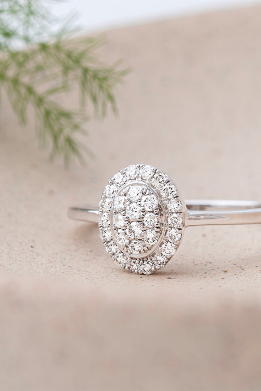 Fraicheur Nº66, L’éclat délicat d’un pavage diamant oval, couronné d’un halo de diamant. Une bague fine et subtile, empreinte de douceur.3 diamants : 0.24 carat – Or blanc (18 carats = 750/-): 2.03 g.