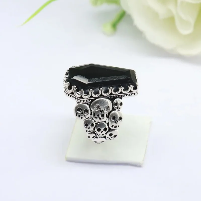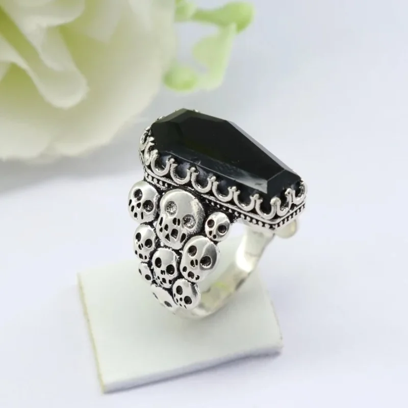 Exprimez votre style avec cette bague gothique en métal, ornée d’une pierre noire mystérieuse et de crânes sculptés. Son design audacieux et ses détails soignés en font un accessoire incontournable pour les amateurs de mode alternative.