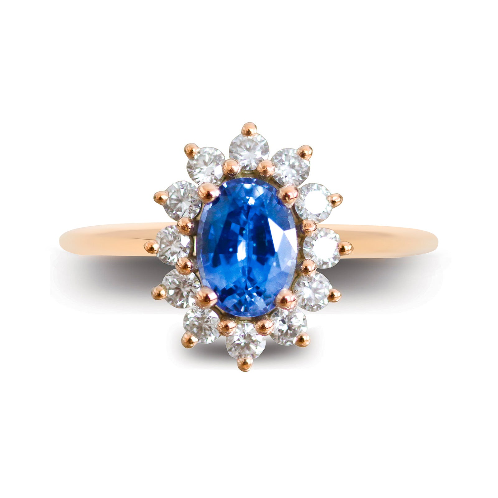 Notre belle Lady Di en or rose et saphir de Ceylan sertie de diamants est un classique intemporel inspiré de la bague de fiançailles de la princesse Diana.