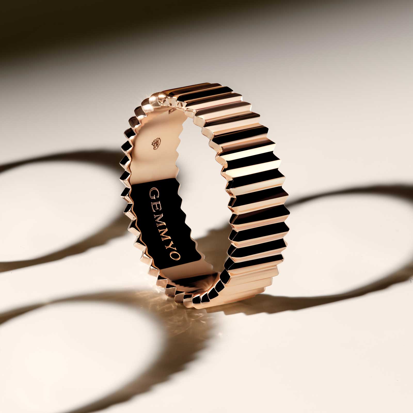 est le résultat d’un travail de précision. La matière est sculptée pour révéler un motif graphique et épuré. Les lignes sont droites et les extrémités pointues pour capter toute la lumière. Les fentes sont polies pour apporter douceur et volume. Cette version large de 6 mm (aussi disponible en
