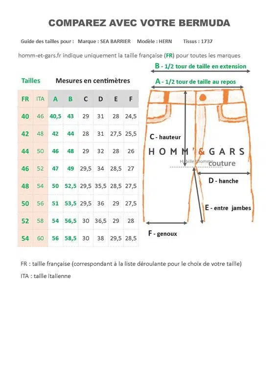Mesure prise par nos soins en mettant le bermuda à plat (nous vous préconisons d’effectuer la même mesure sur votre pantalon ou bermuda avant de commander).