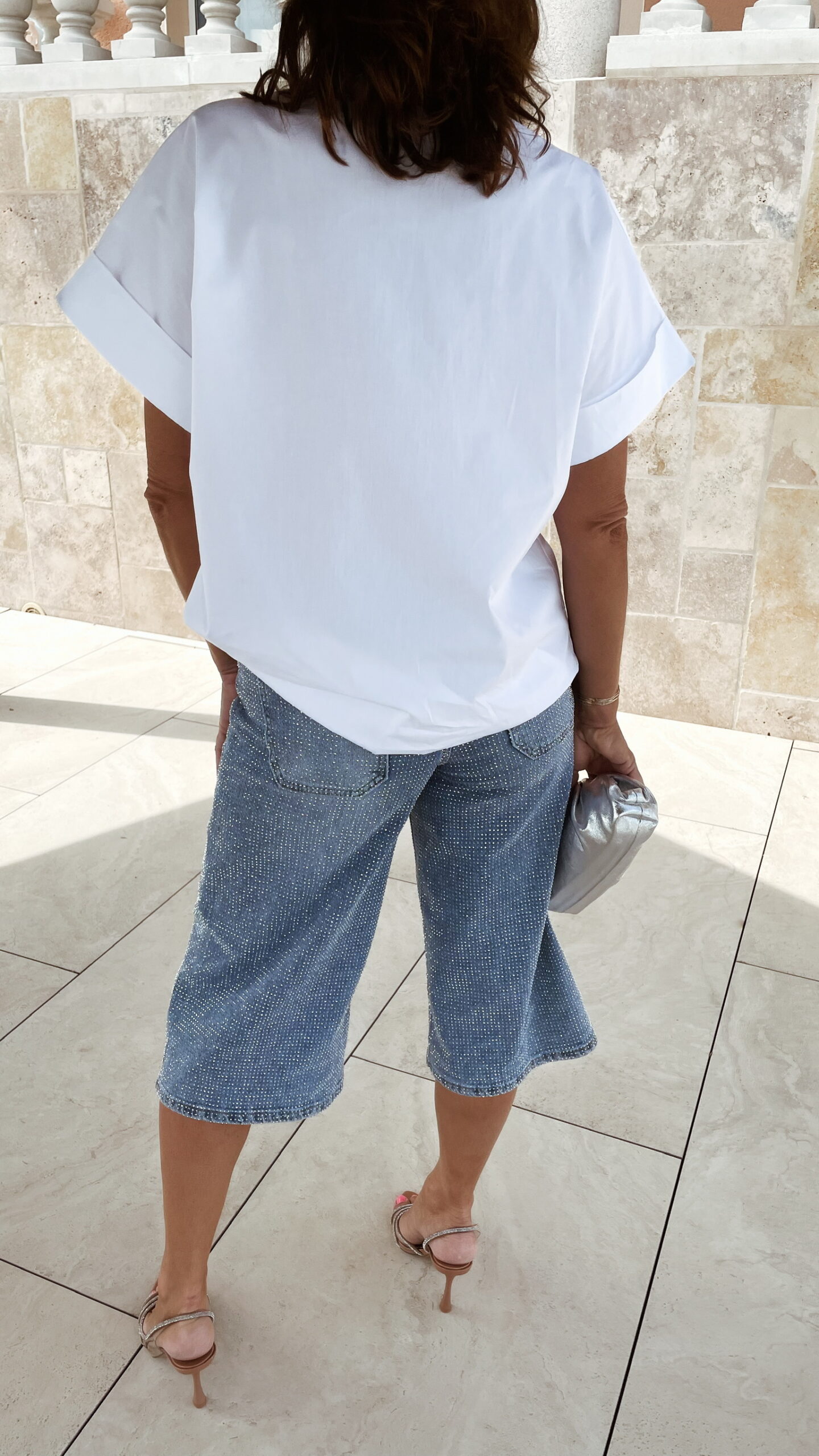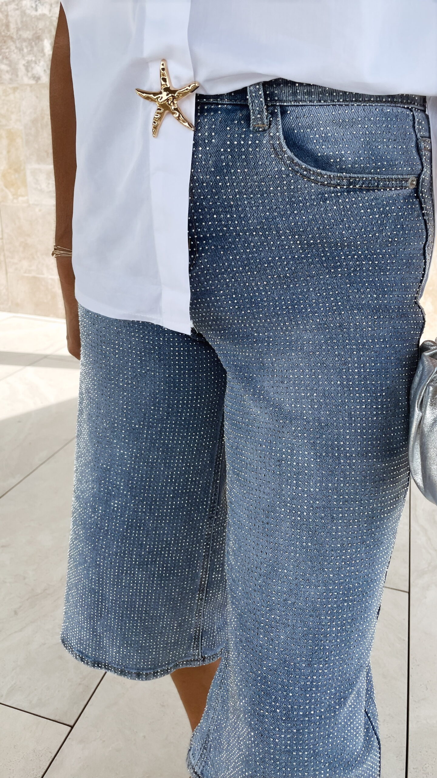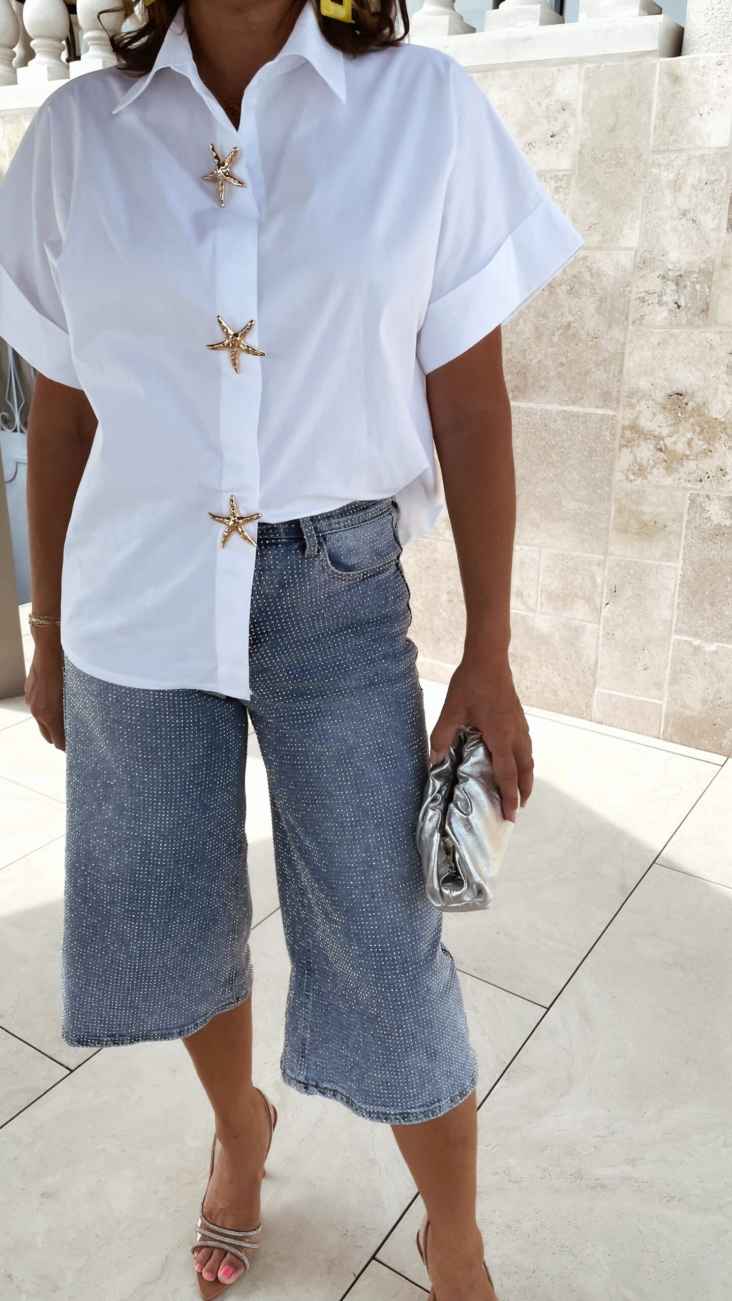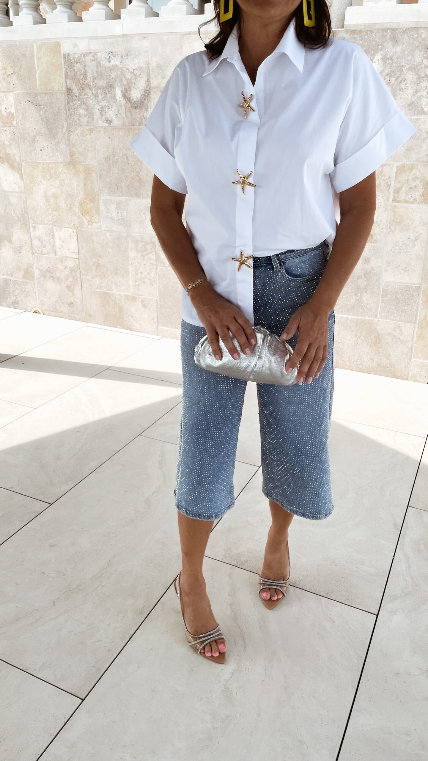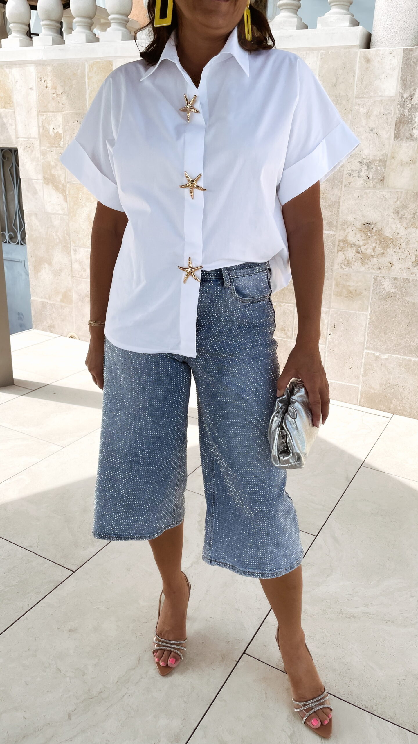 -Le Bermuda à strass est porté avec la chemise Luna et ses broches étoiles de mer, avec le sac mini SELENA argenté, et les boucles d’oreilles clip jaune.