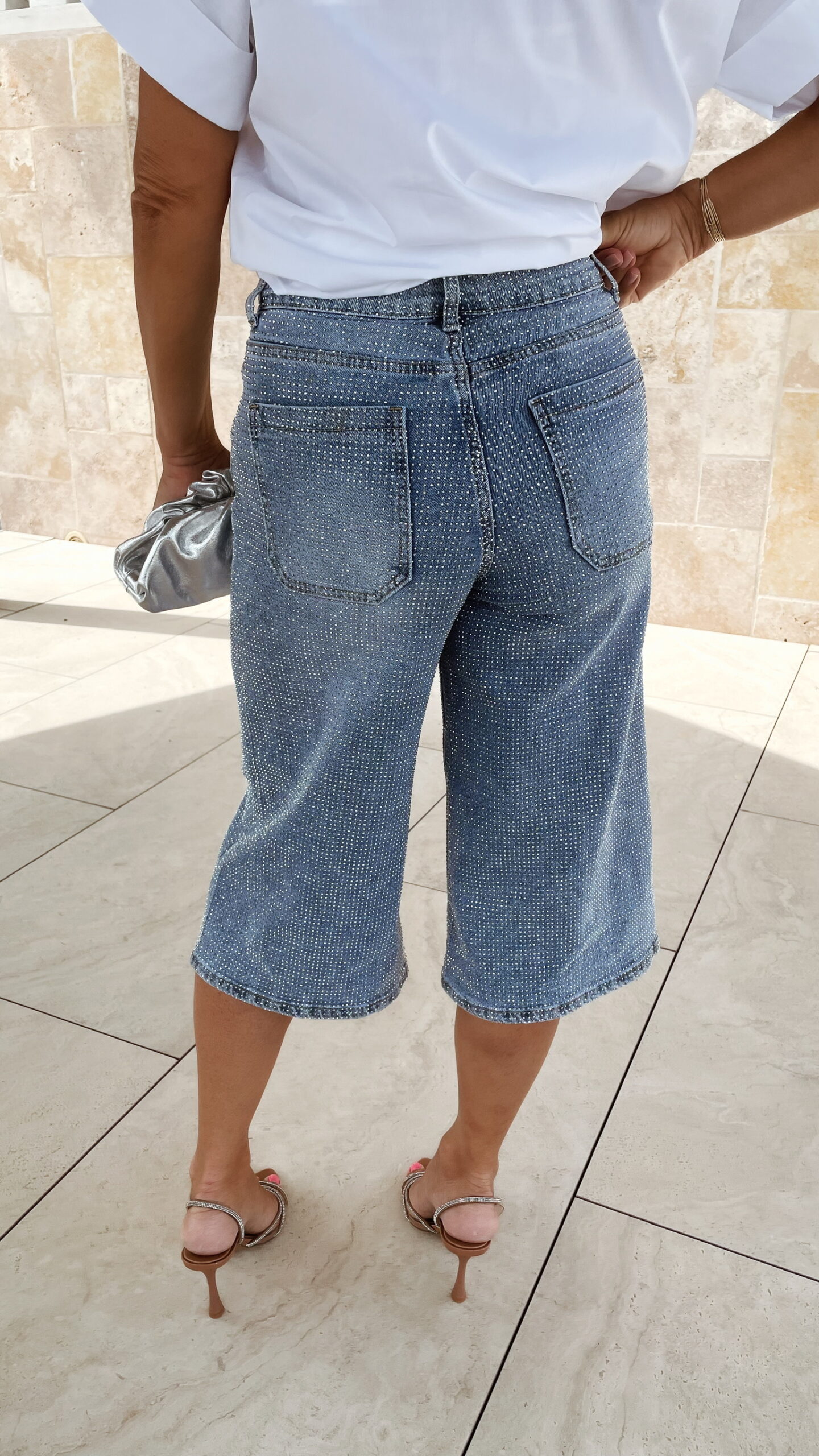 -Bermuda jean bleu clair avec des strass avant et arrière.