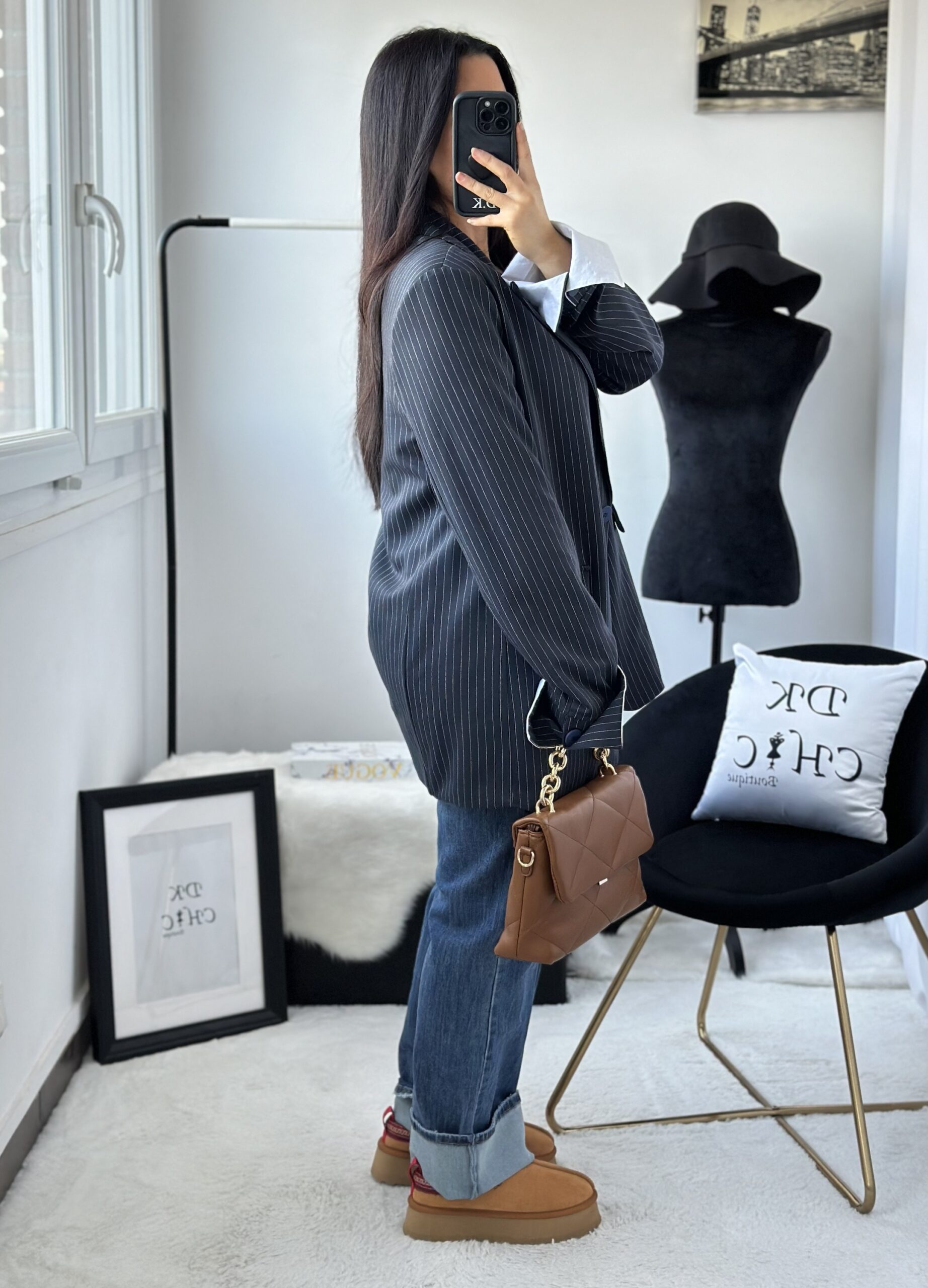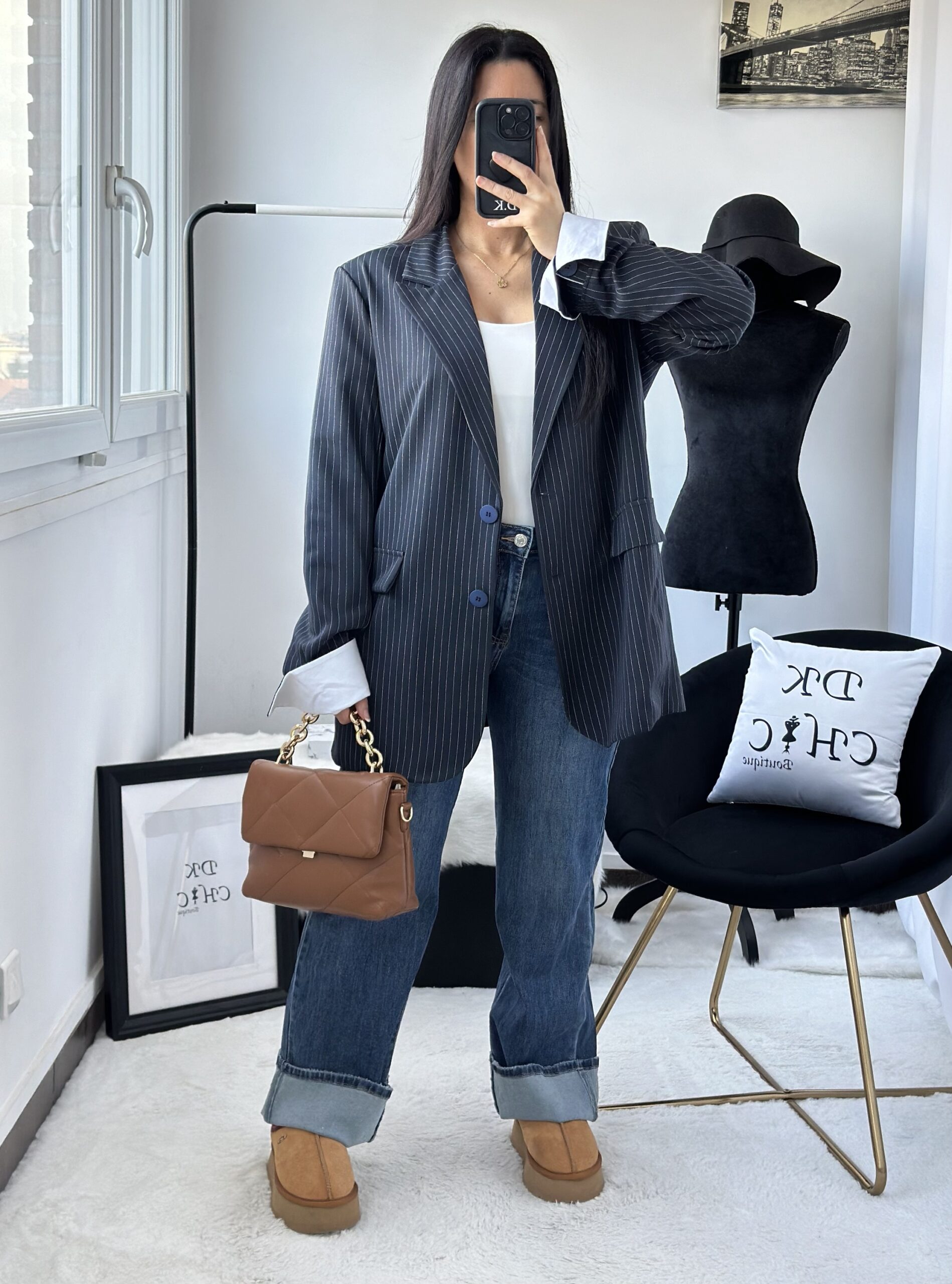 – Blazer marine à rayures blanche et manches à revers blanc