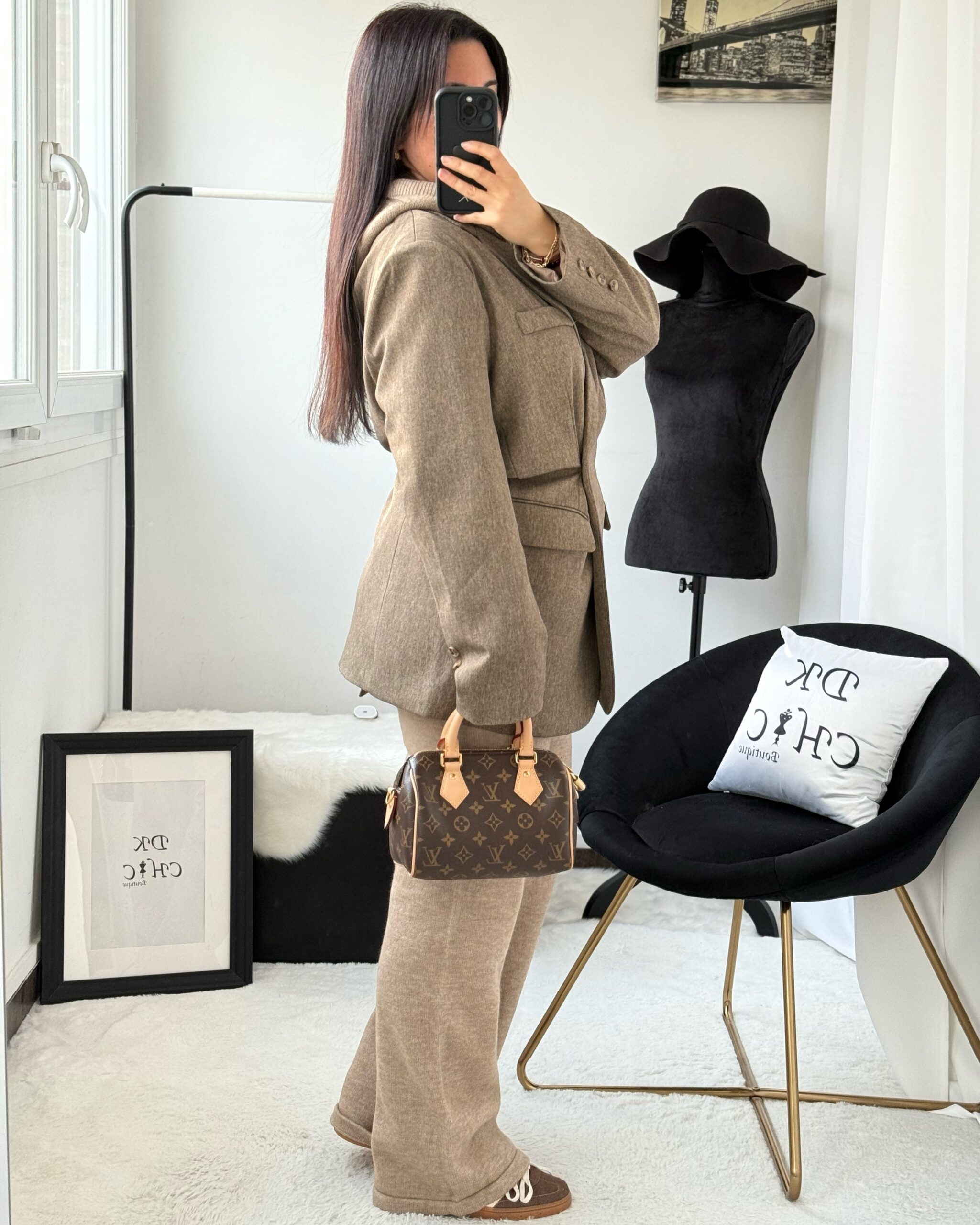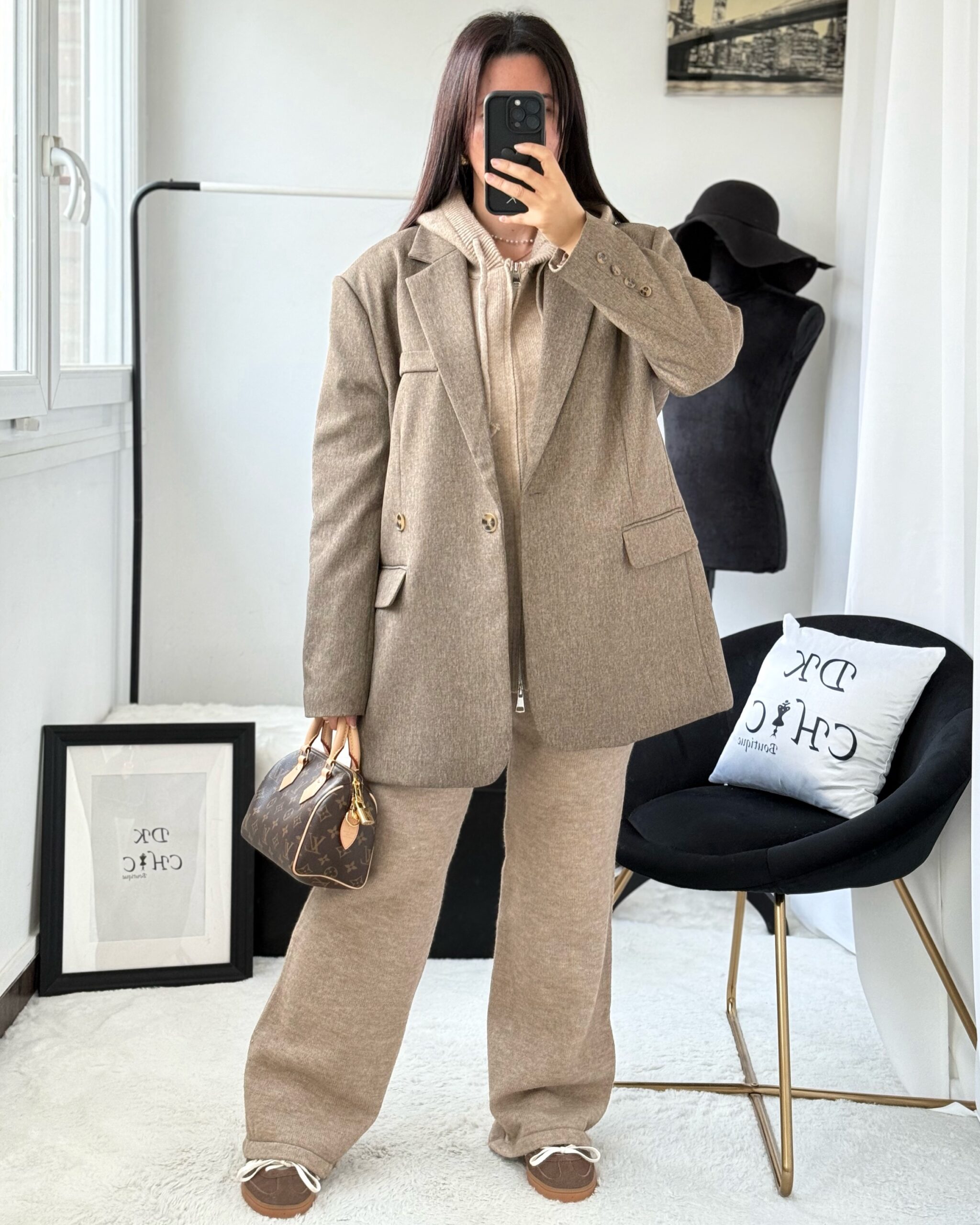 – Blazer mi-long avec possibilité de fermer sur le côté derrière et devant pour passer d’un blazer oversize à cintrer