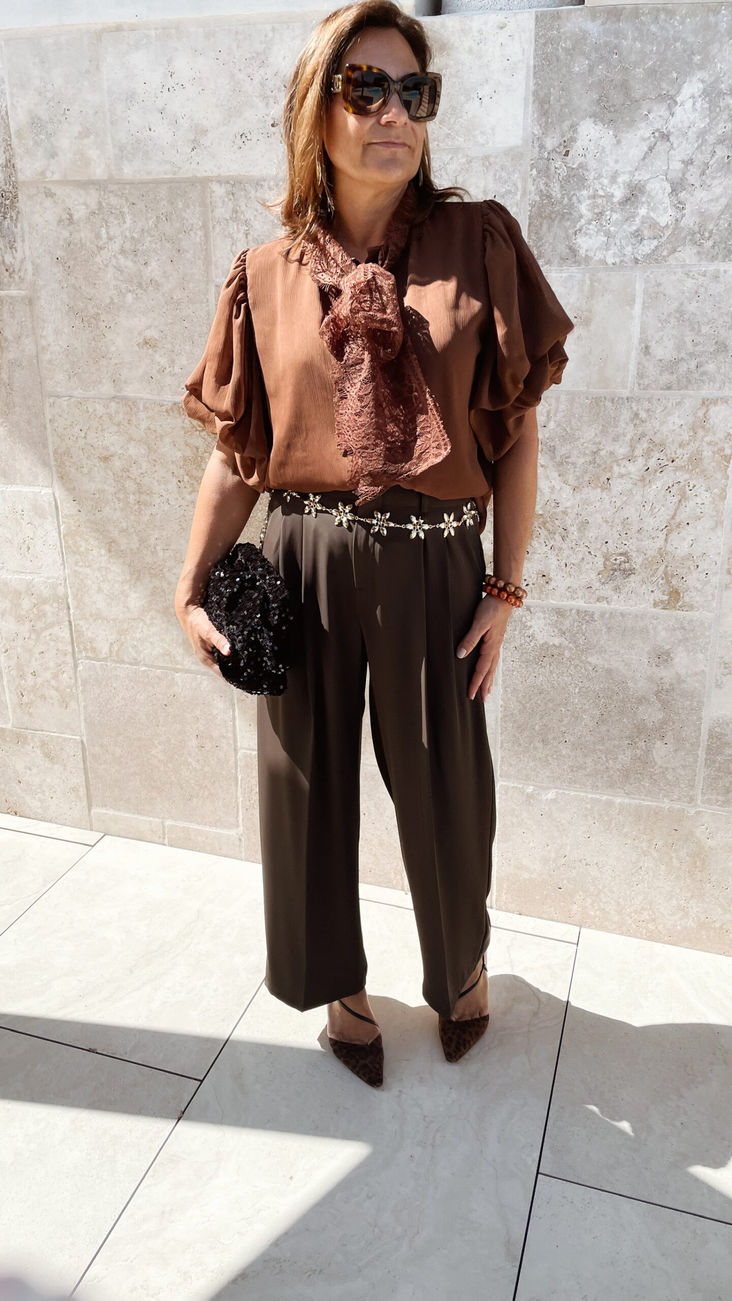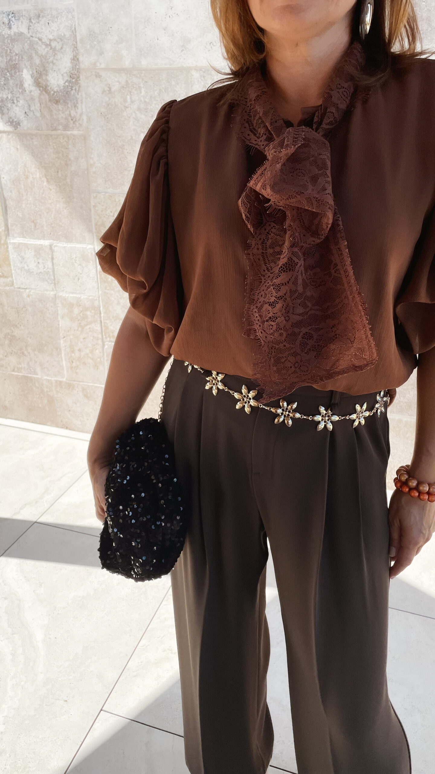 -La blouse café Chloé est portée avec le pantalon Giorgio, le sac sequin boum noir, et la chaine dorée fleurs.