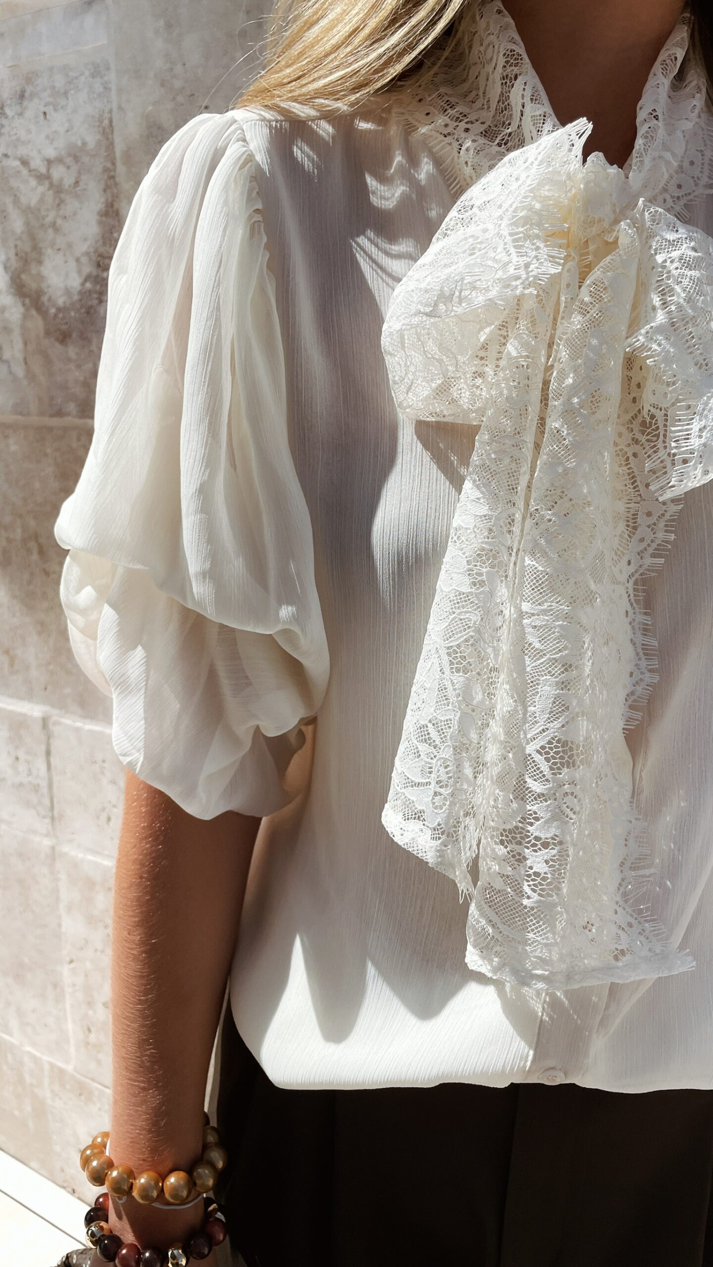 -Blouse couleur écru avec un long col en dentelle à nouer, fermeture par boutons.