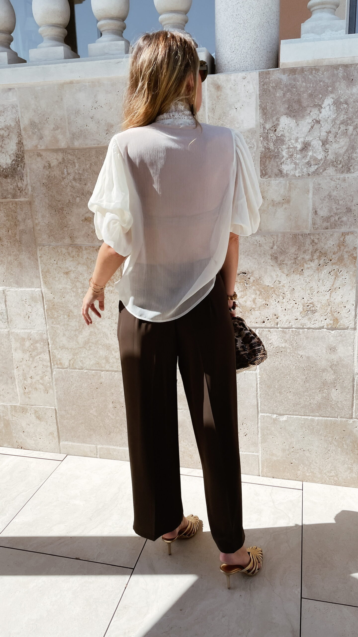 -La Blouse Ecrue Chloé est portée avec le pantalon Giorgio, la ceinture chaine dorée fleurs et le sac sequin boum leopard.