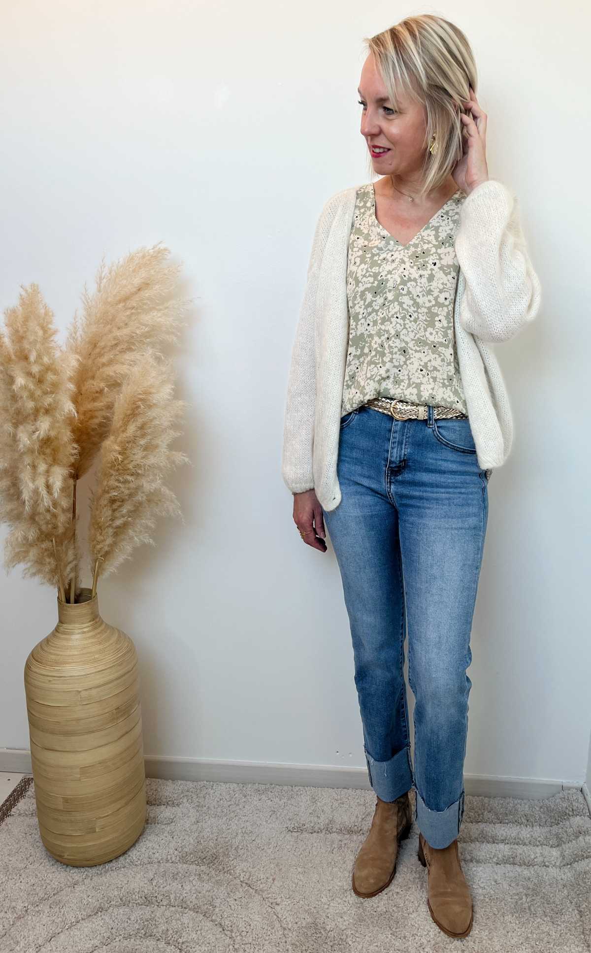 Son imprimé fleuri délicat dans les tons vert sauge et beige apporte une touche naturelle et douce, parfaite pour un look lumineux.
