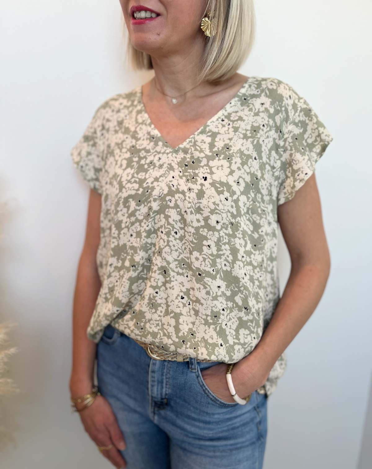 BLOUSE FLEURIE BEIGE VERT