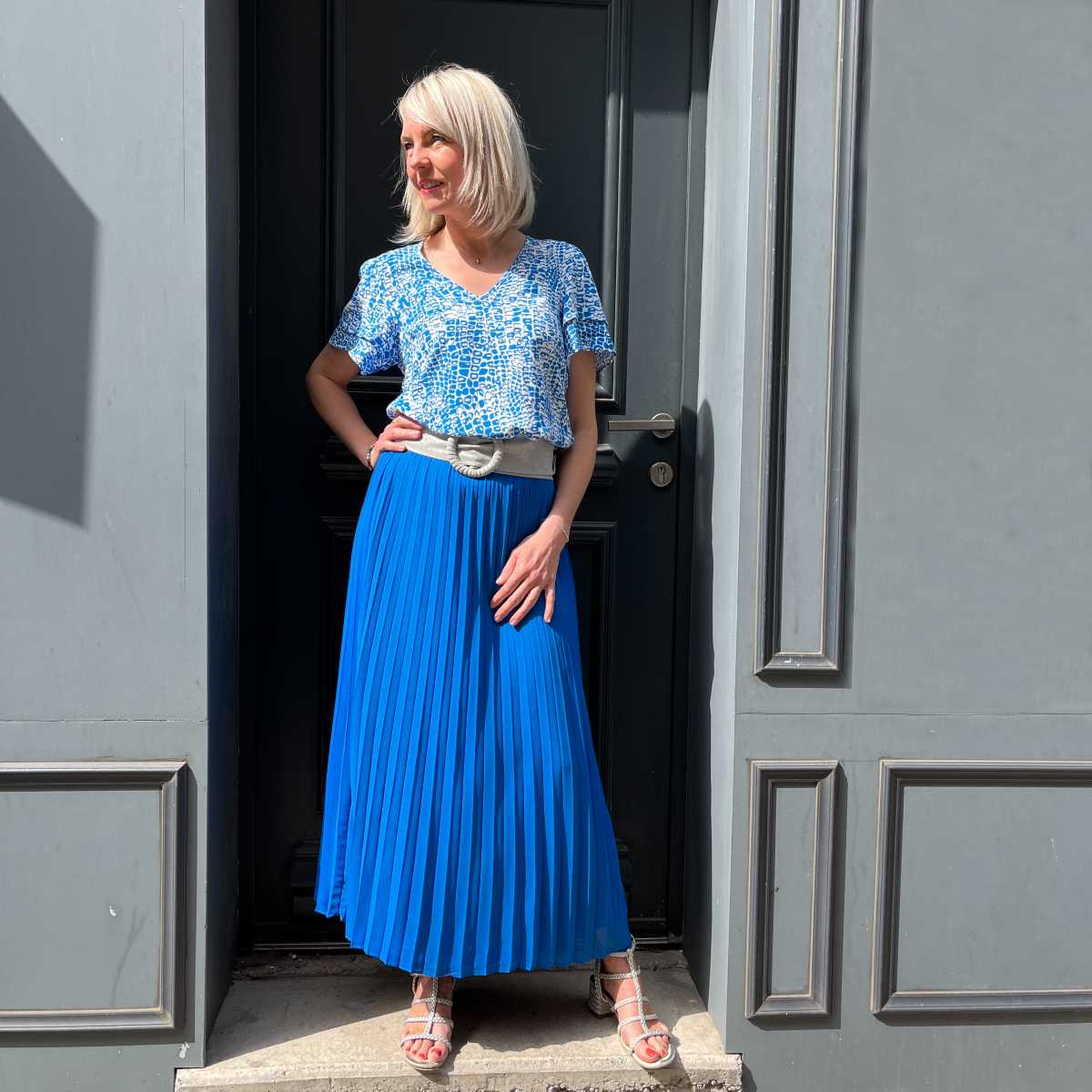 Portez la blouse imprimé bleu avec la jupe plissée bleue pour un style élégant juste parfait pour des occasions.