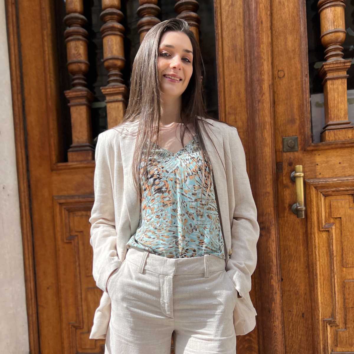 Portez la jolie blouse imprimé vert d’eau avec le short en lin et le blazer en lin : un total look chic !
