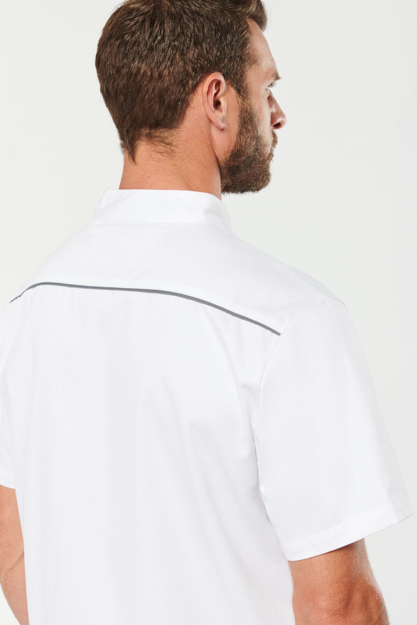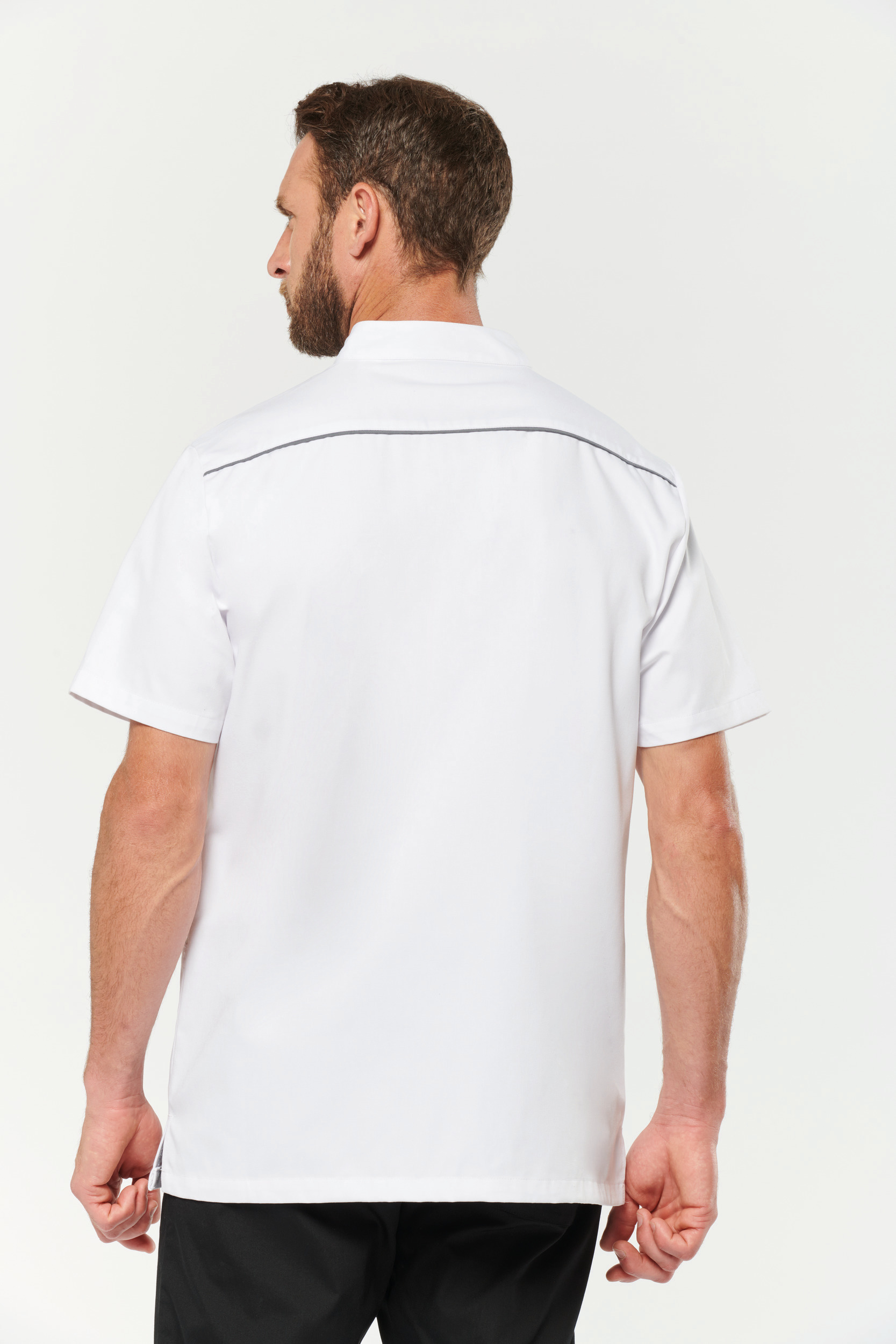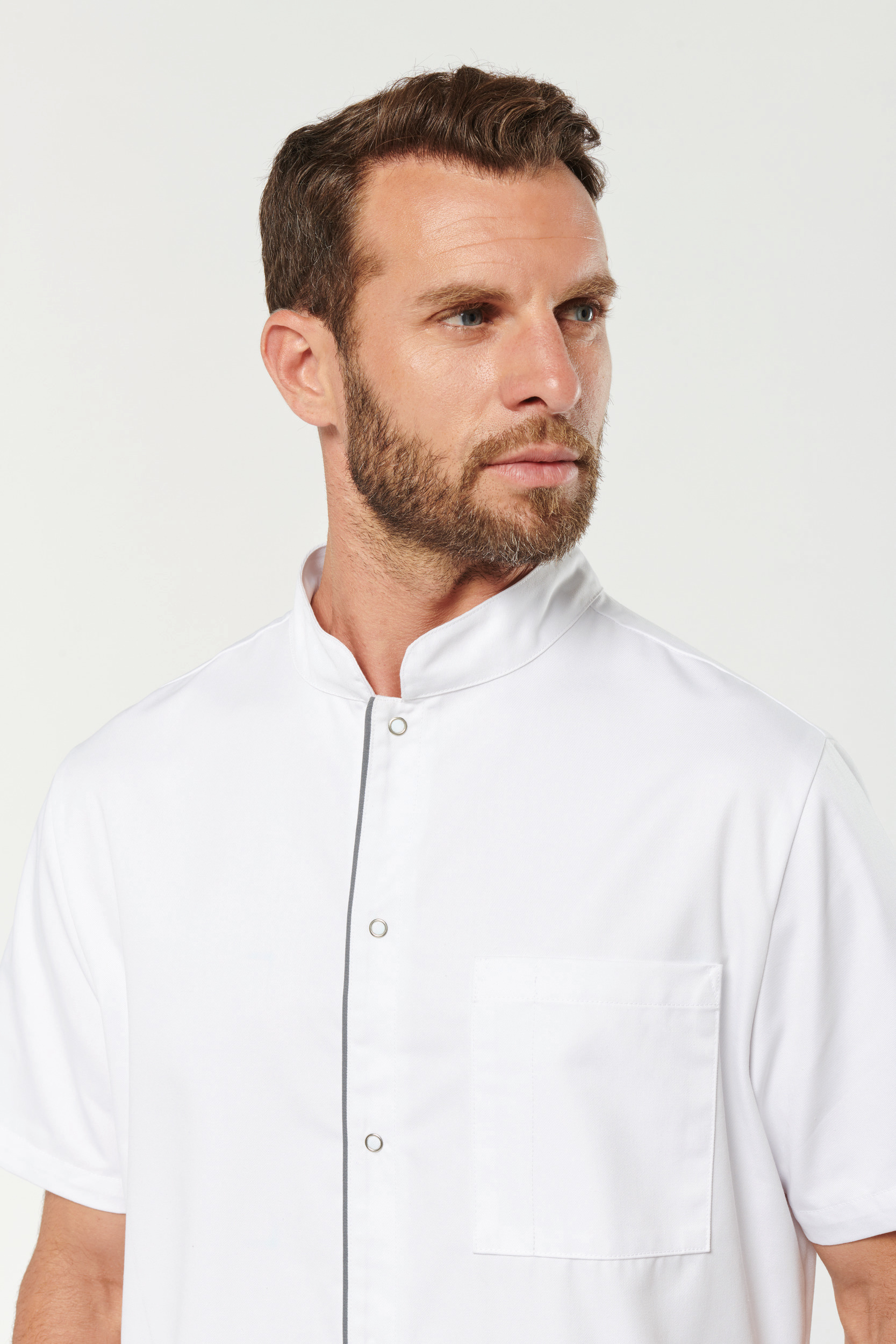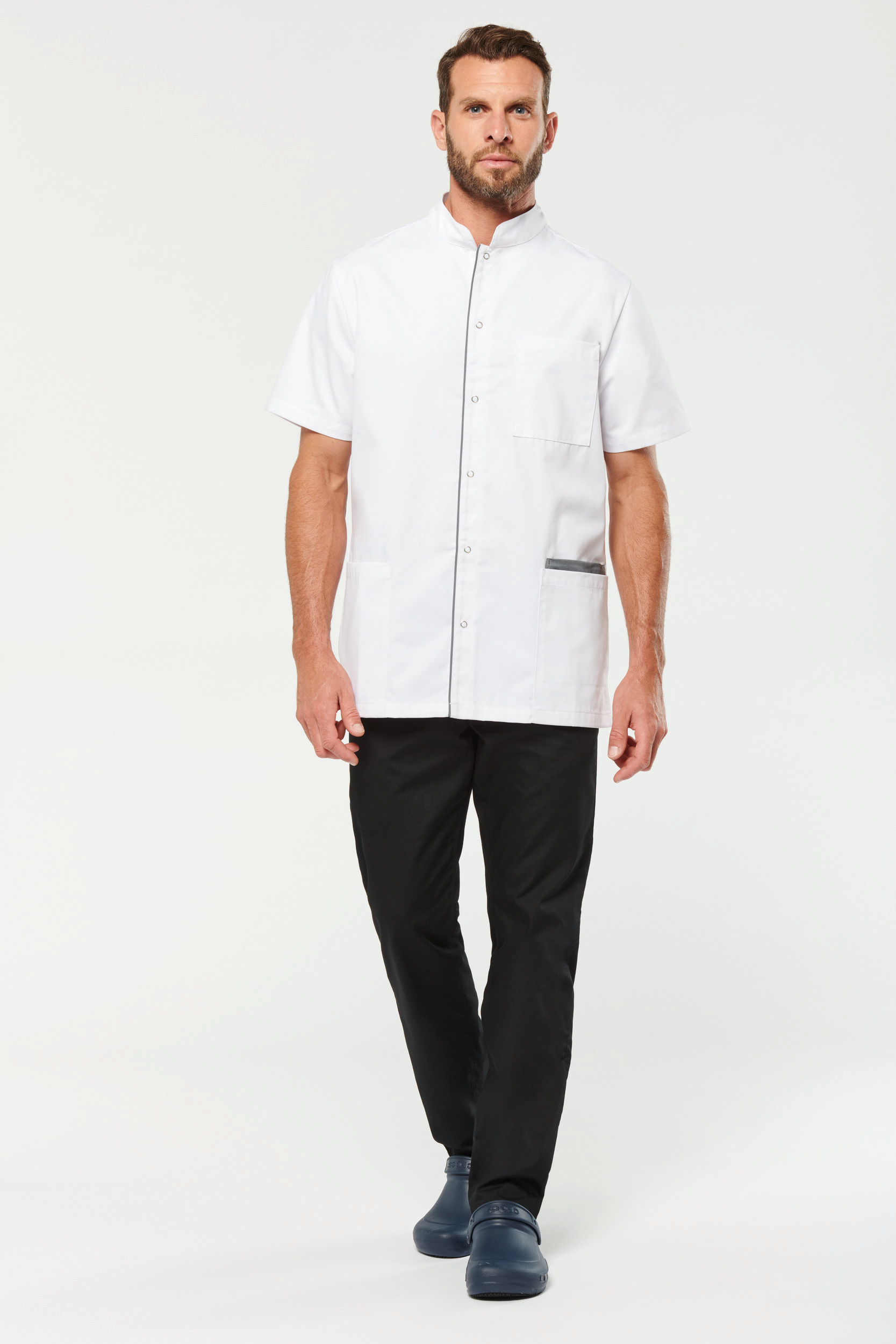 65% polyester / 35% coton. Tissu twill polycoton. Lavage à 60°C. Coupe droite. Col mao. Fermeture avant avec boutons pression. 1 poche poitrine plaquée côté cœur avec compartiment stylo. 2 grandes poches plaquées avant dont une (à gauche) à double compartiments (poche intérieure à bord contrasté). Passepoil contrasté sur la patte de fermeture et sur l’empiècement dos. 2 fentes d’aisance latérales. Etiquette nom à l’intérieur du vêtement. Etiquette de marque Tear-away.
