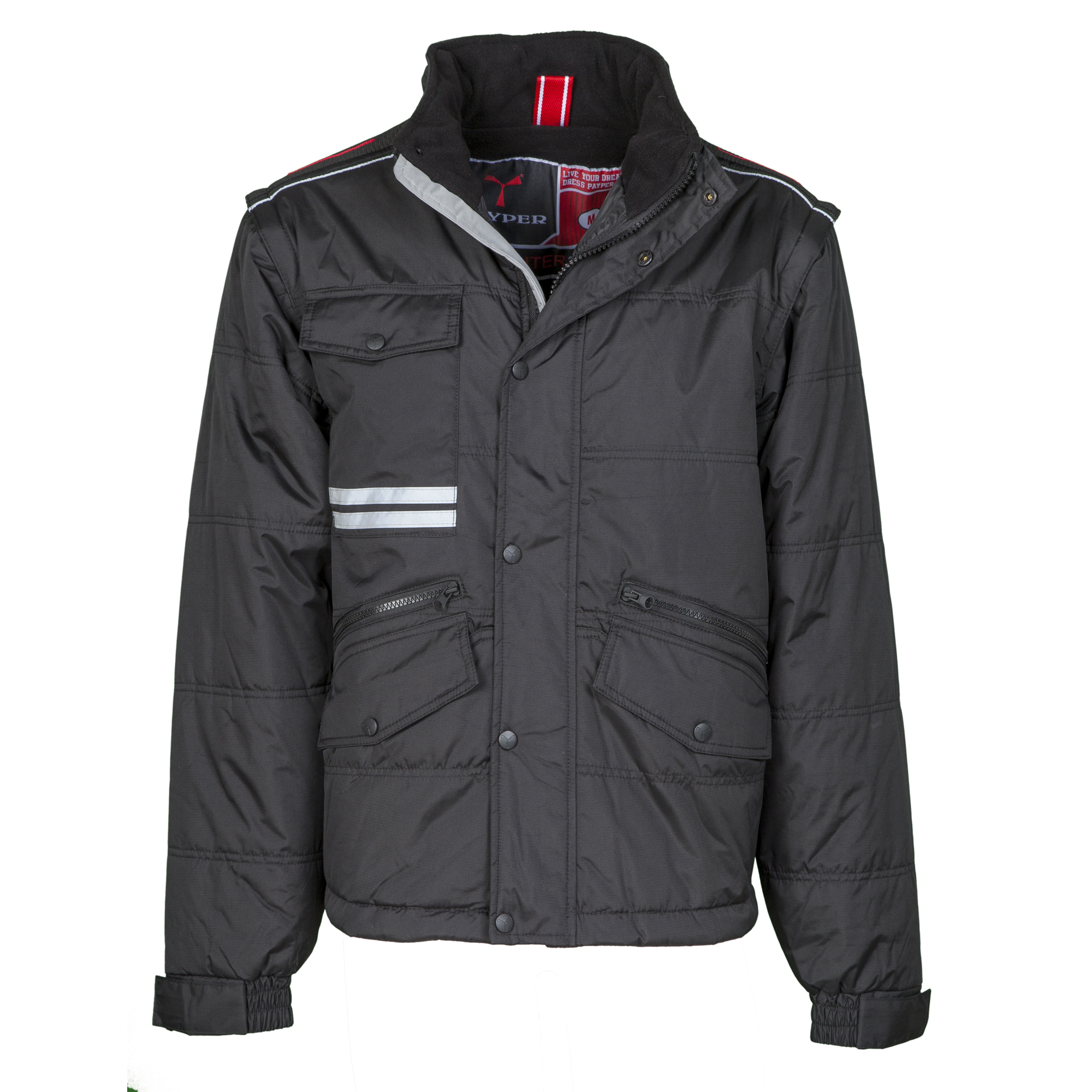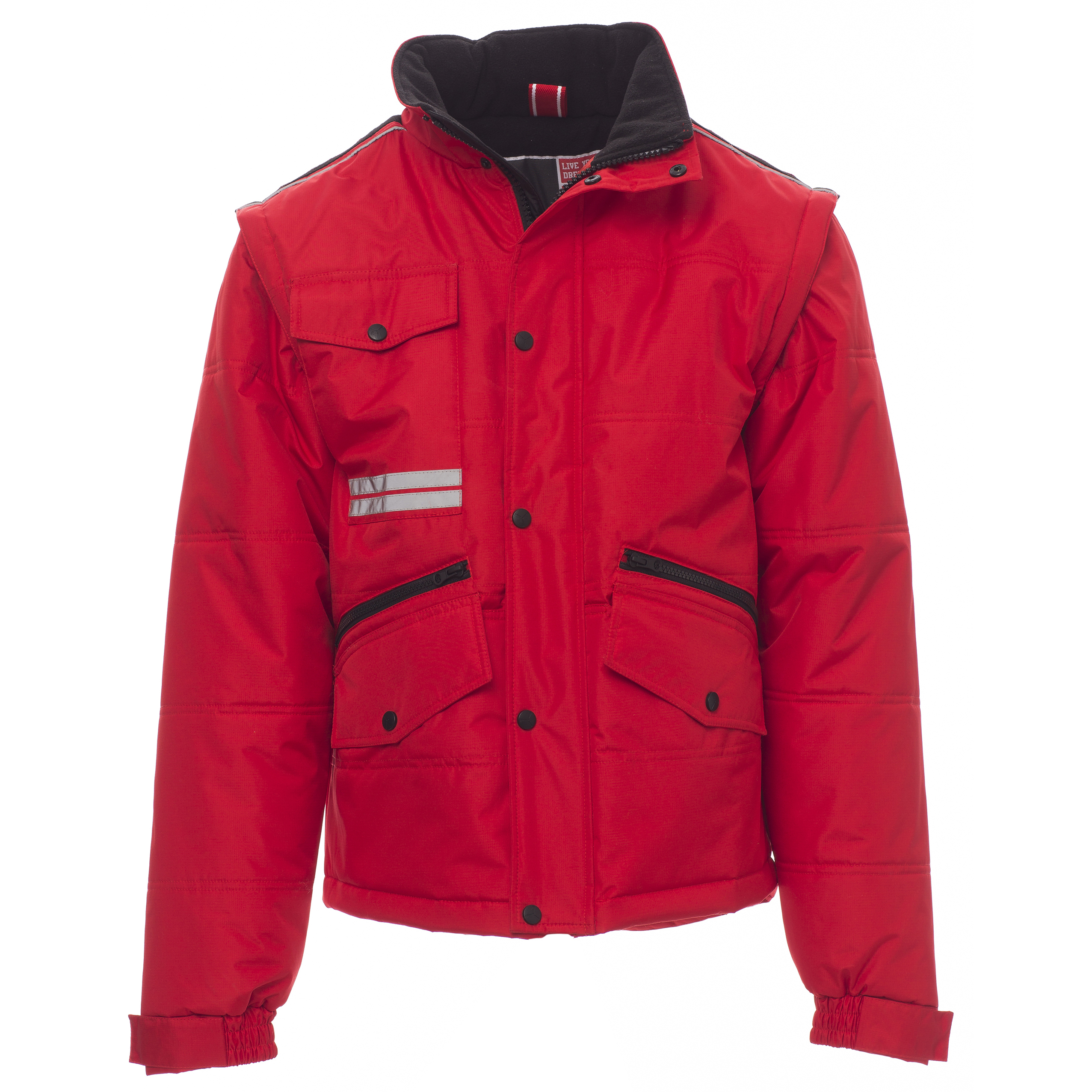 Blouson homme, à manches détachables, fermeture éclair de 8 mm en plastique avec curseur en métal, à rabat et boutons en plastique, arrière profilé, deux poches extérieures LOCK SYSTEM et deux poches à fermeture éclair, poches obliques pour faciliter l’introduction des mains, une poche de poitrine pour smartphone et anneau porte-badge, passepoils réfléchissants sur poche de poitrine et au dos. Intérieur : rembourré, polaire en contraste au dos et sur le col, une poche, fermeture éclair intérieure pour faciliter impressions et broderies.