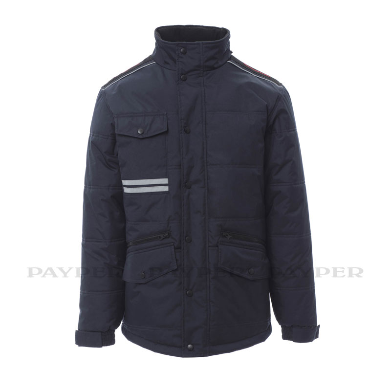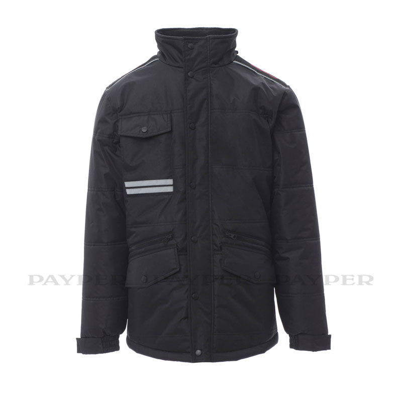 Blouson homme 3/4, zip en plastique de 8 mm avec curseur en métal, à rabat et boutons en plastique, dos profilé et capuche repliable dans le col, deux poches extérieures LOCK SYSTEM et deux poches zippées, poches obliques pour faciliter l’introduction des mains, une poche poitrine pour smartphone et anneau porte-badge, bandes réfléchissantes sur la poche et le dos.