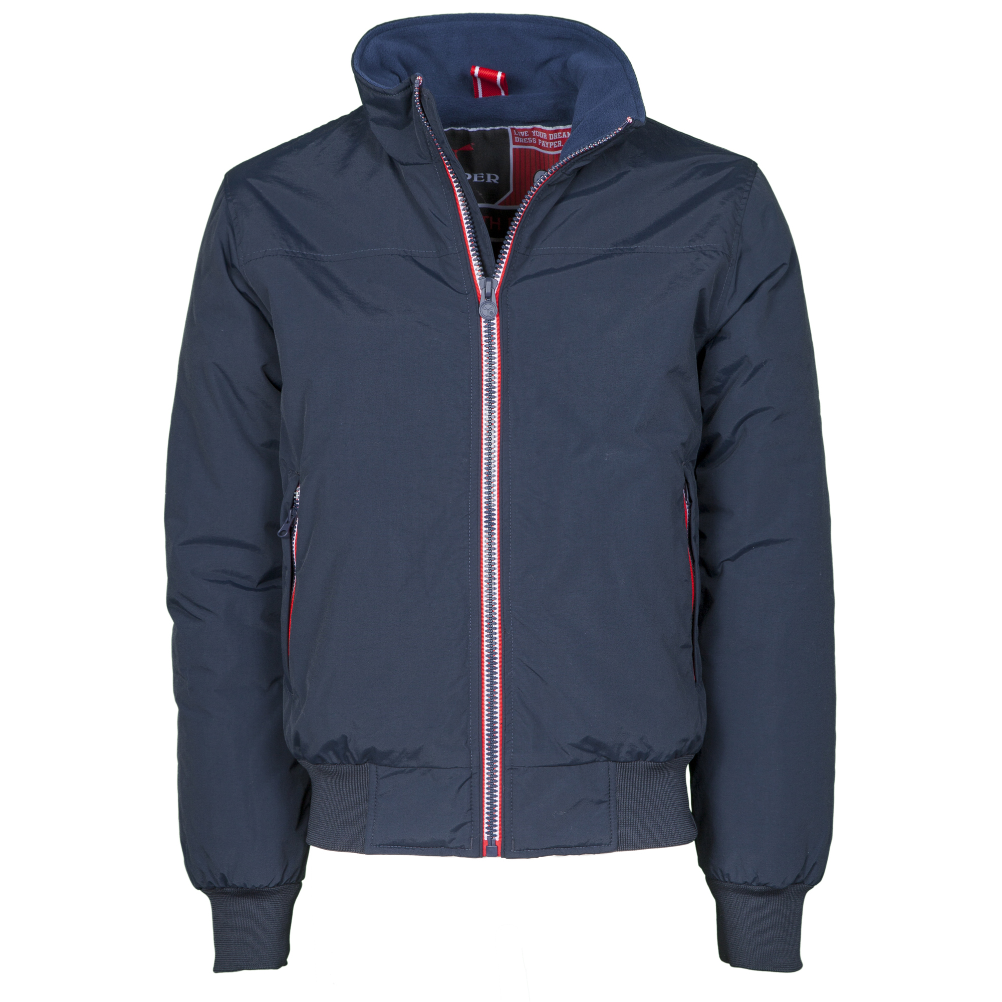 Blouson homme à zip contrasté, en plastique avec curseur en métal ; poignets et taille en bord-côte élastique, deux poches extérieures avec zip couvert. Intérieur : rembourré, micropolaire sur le col et le dos, une poche zippée pour smartphone avec passage pour câble, zip sur la poitrine et le dos pour faciliter impressions et broderies.