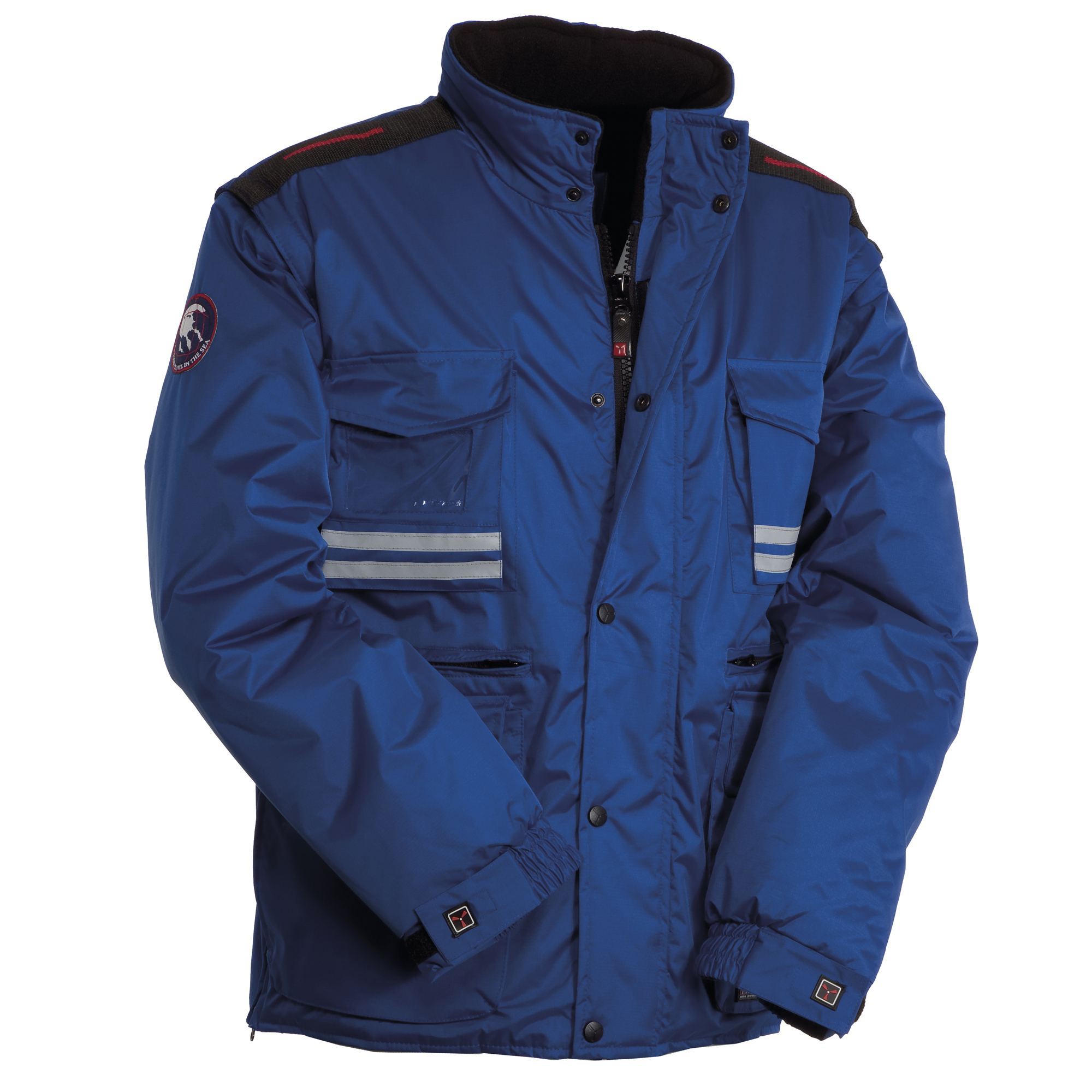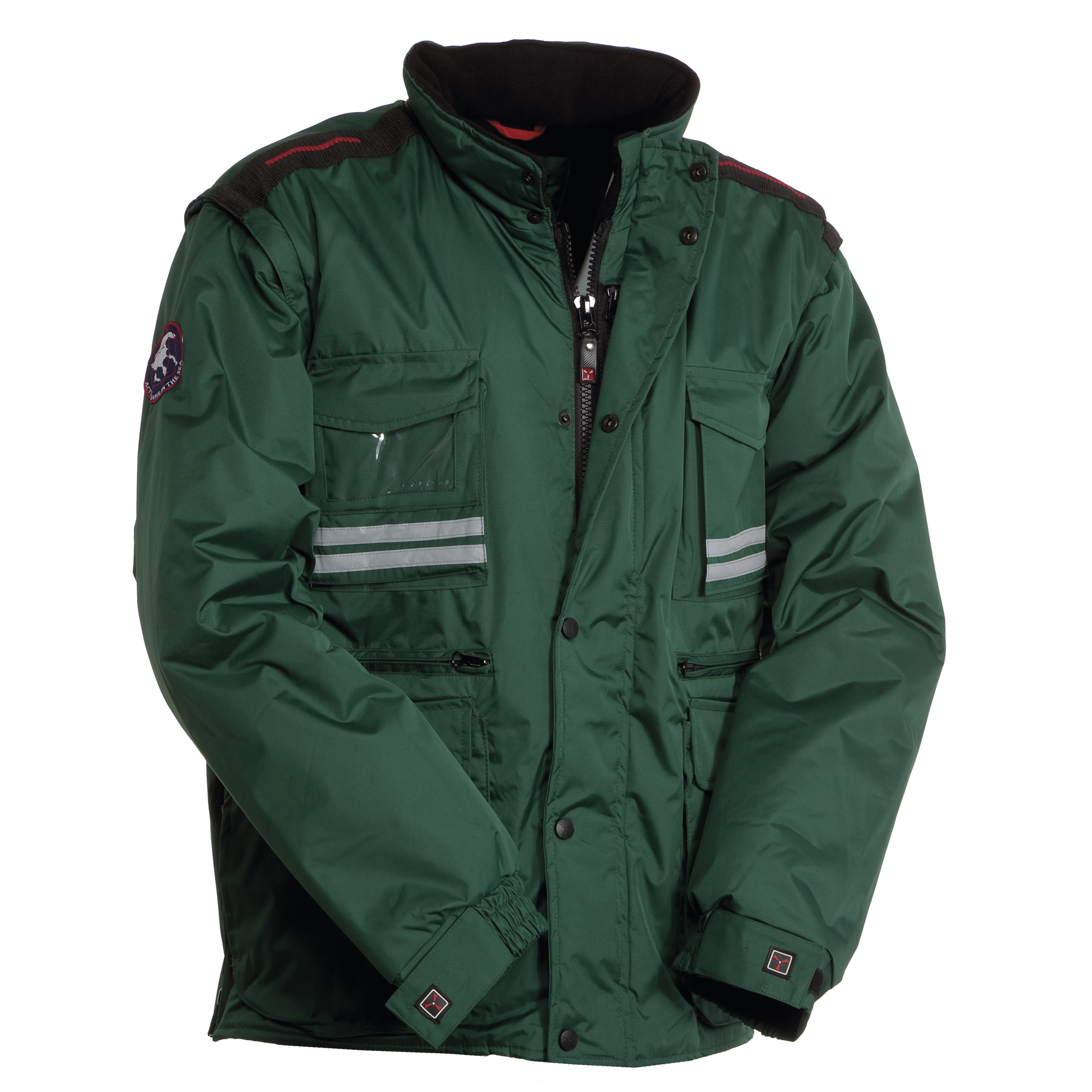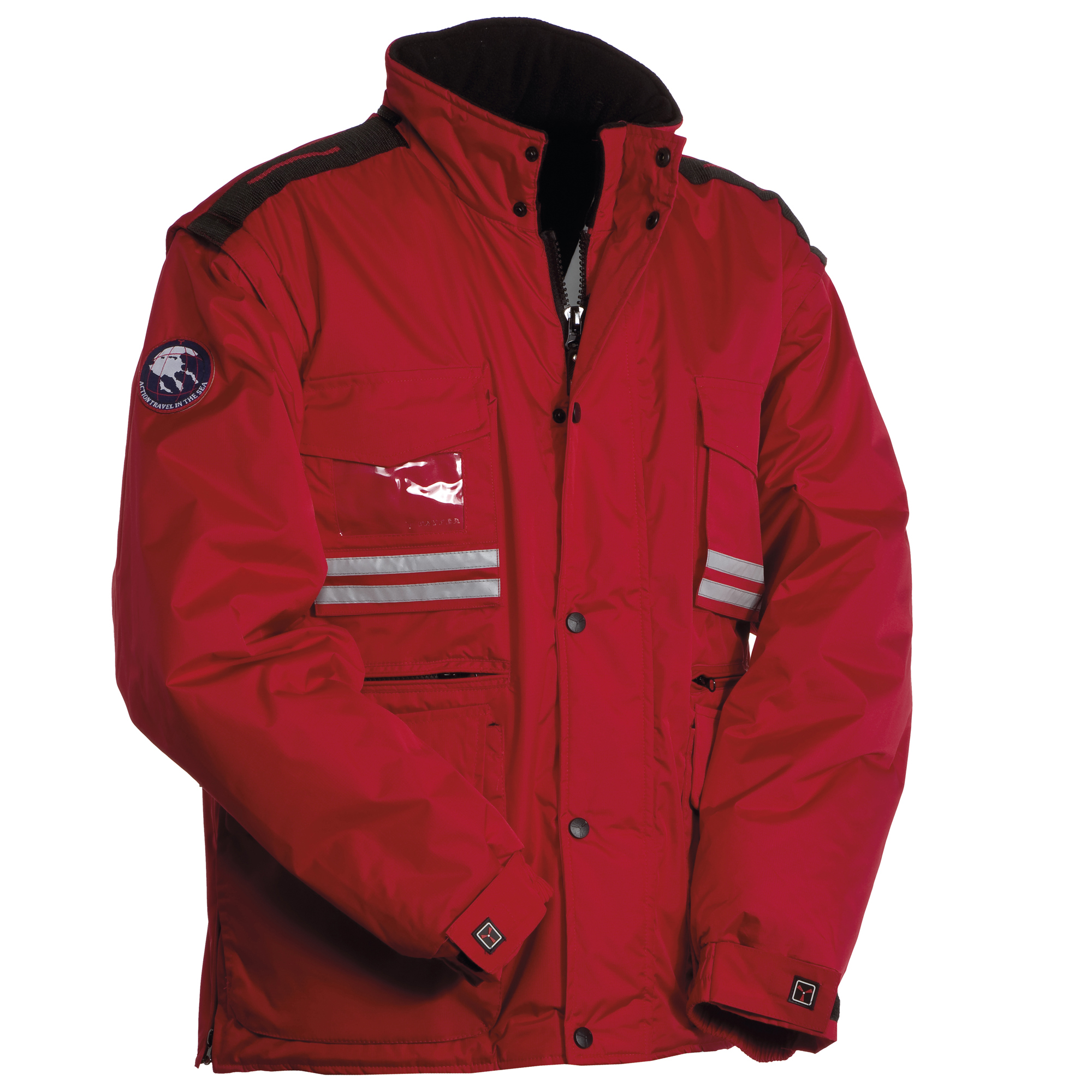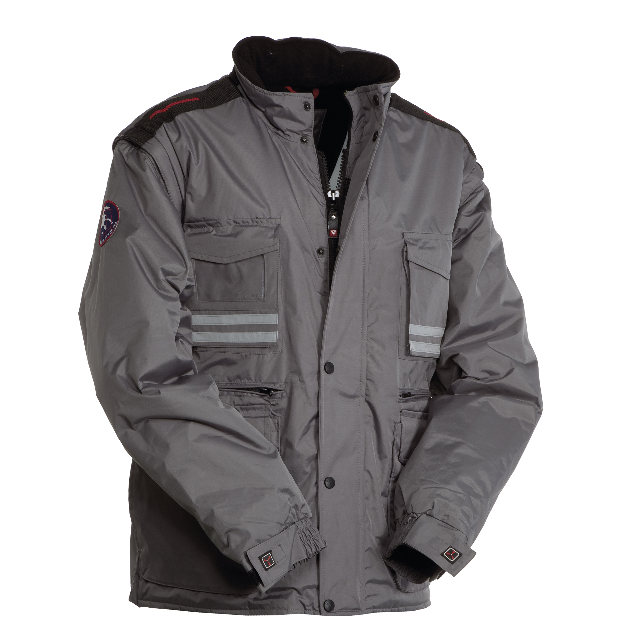 Blouson homme, avec manches détachables, zip de 8 mm en plastique avec curseur en métal, rabat et boutons en plastique, capuche profilée détachable et/ou repliable dans le col, poignets réglables, passepoils réfléchissants gris devant et derrière, coudes préformés, fente latérale à soufflet et zip, neuf poches extérieures dont deux LOCK SYSTEM, deux zippées et intérieur renforcé, une avec porte-badge réversible. Intérieur : rembourré, col, dos et chauffe-reins en micropolaire, inserts transpirants sous le bras, coulisse à la taille et fermeture éclair intérieure pour faciliter impressions et broderies.