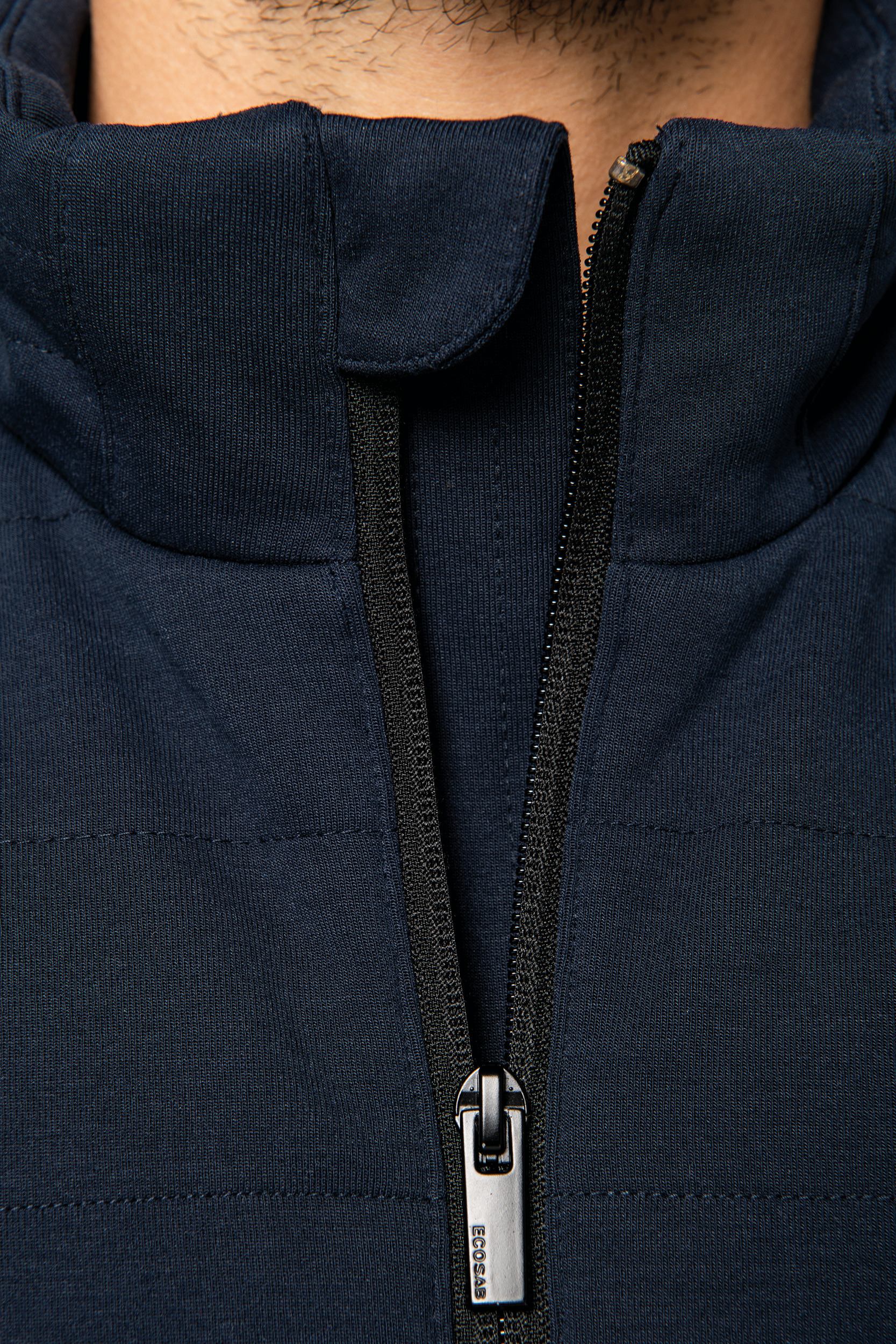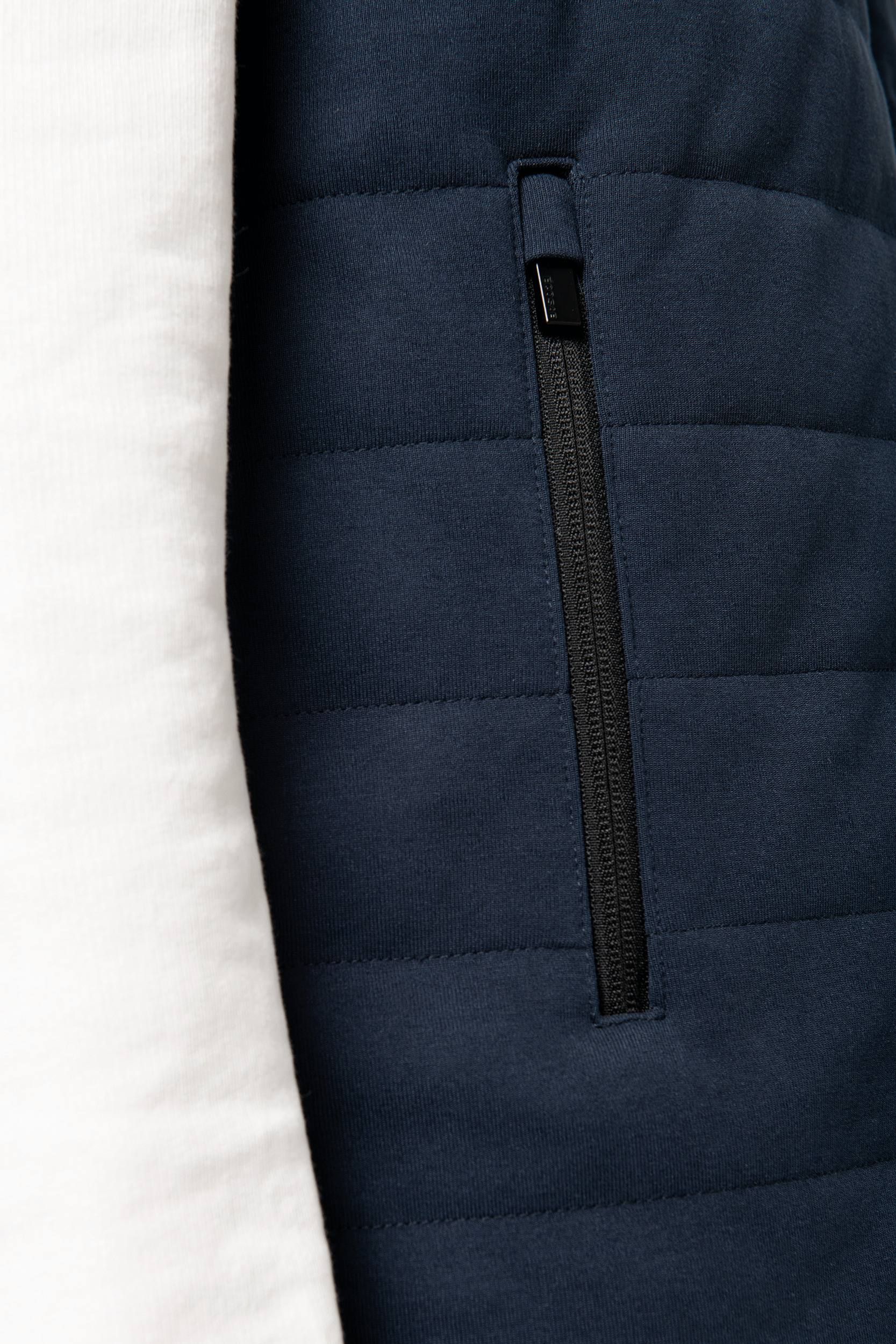 Zip inversé contrasté noir en nylon recyclé milieu devant et poches côtés avec tire-zip en métal recyclé.