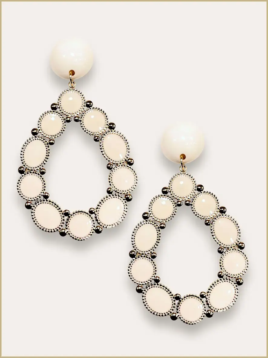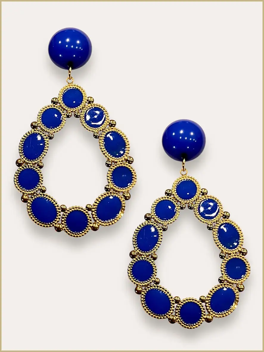 Avec leur pendentif en forme de goutte, elles sont délicatement ornées de cercles dentelés rehaussés d’une touche de résine colorée.