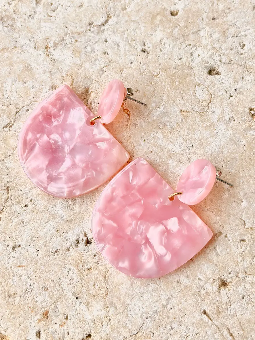 Une touche chic et tendance pour ces boucles et sa puce d’oreille coordonnée, avec une demi-lune en acétate aux nuances de roses légèrement nacrées