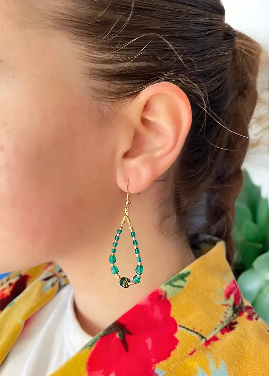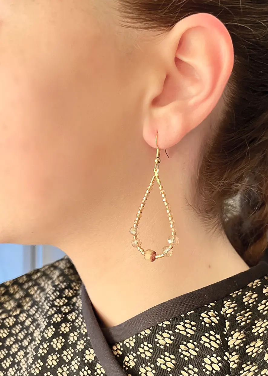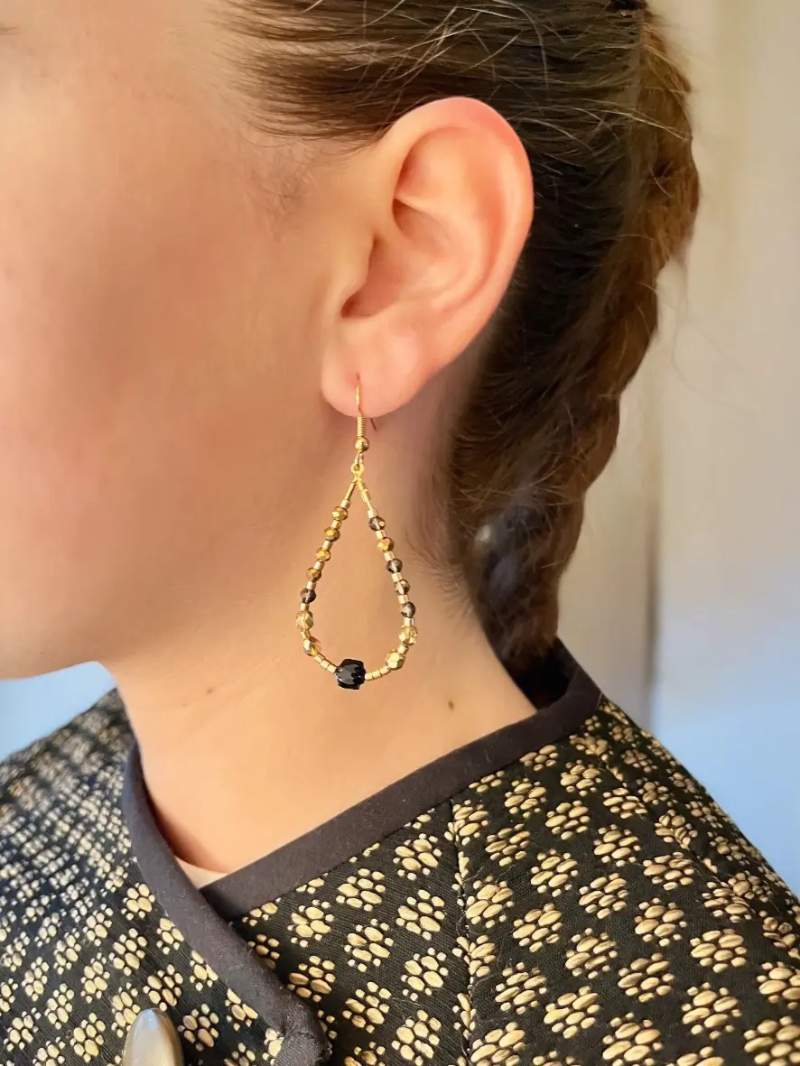 Chaque boucle d’oreille est composée d’un pendentif en forme de goutte, habillé avec soin de perles en verre colorées, d’une perle antique de Bohème et de fines perles dorées.