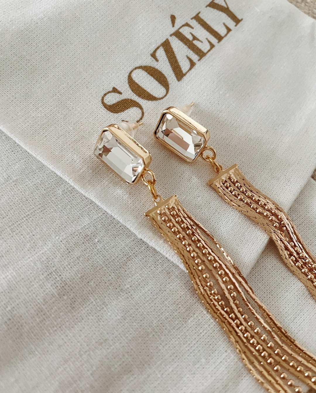 Boucles d’Oreilles strass et pendentif chaines fines doré à l’or fin. Création française dans notre atelier lyonnais. Modèle unique, édition limitée.