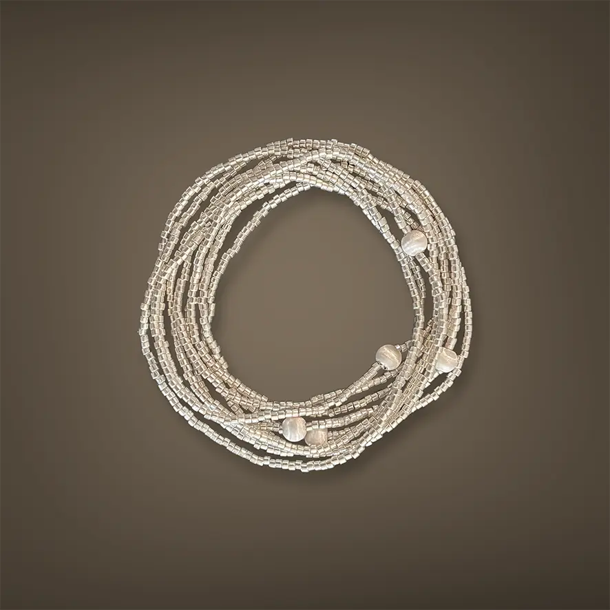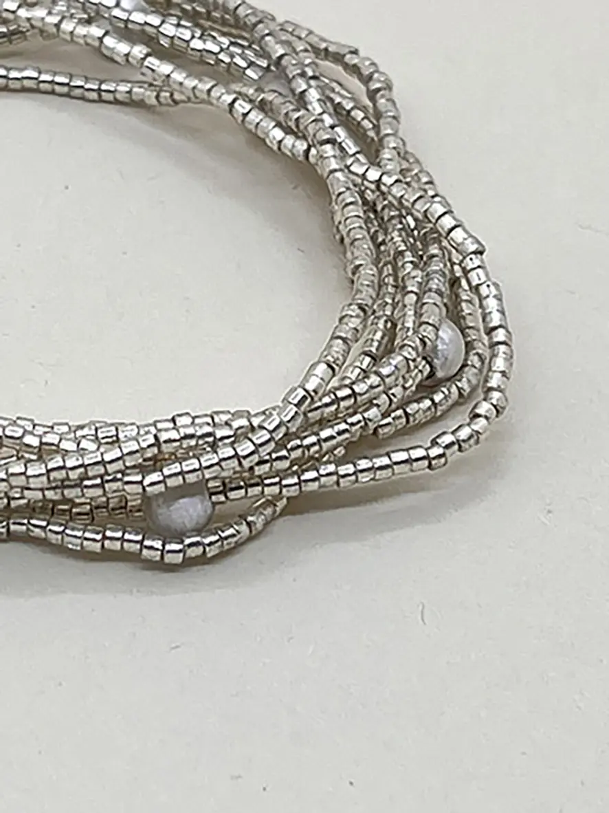Ses très fines perles argentées courent sur le bracelet au gré des mouvements de votre poignet ou… autour de votre cou car il se porte également en collier mi-long ou en sautoir extra long !