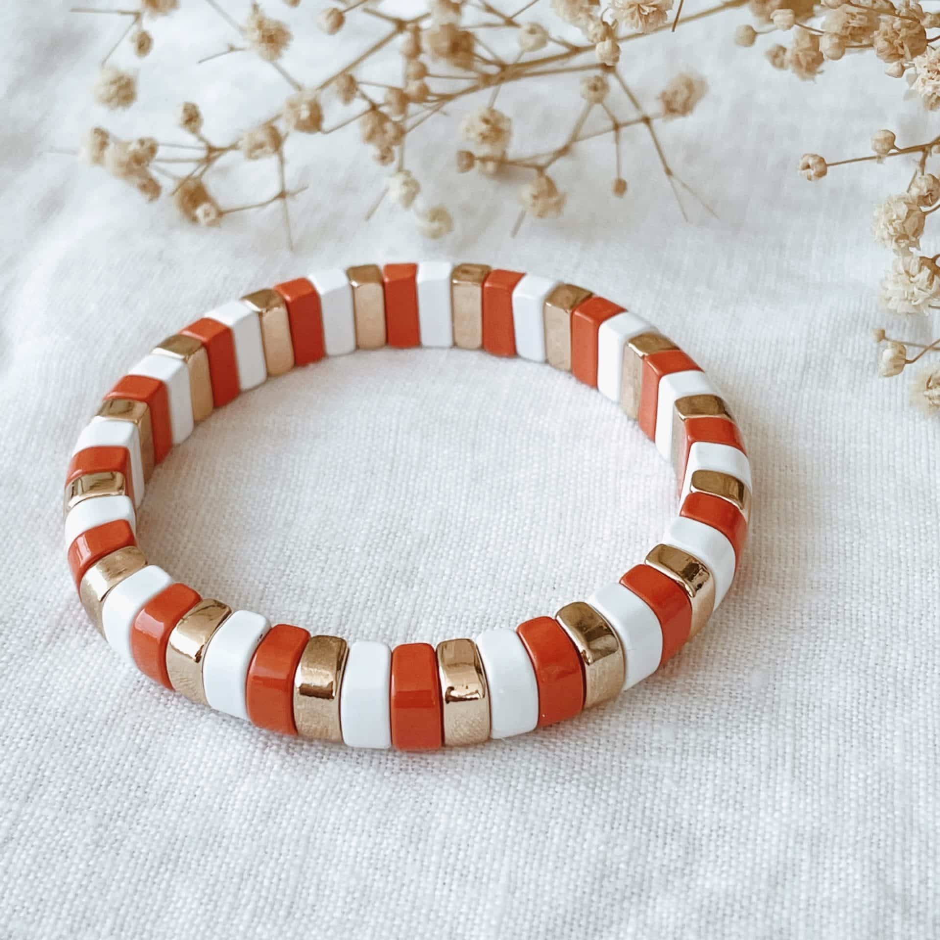 Bracelet en émail coloré et effet miroir doré, laiton de haute qualité, monté sur double élastiques résistants.