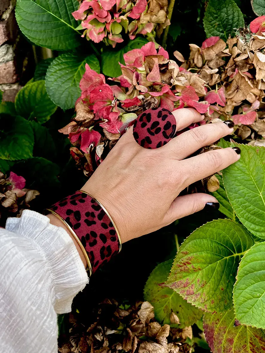 Ce bracelet se coordonne parfaitement avec une bague anneau ou une bague ronde en grand format, arborant le même imprimé léopard.