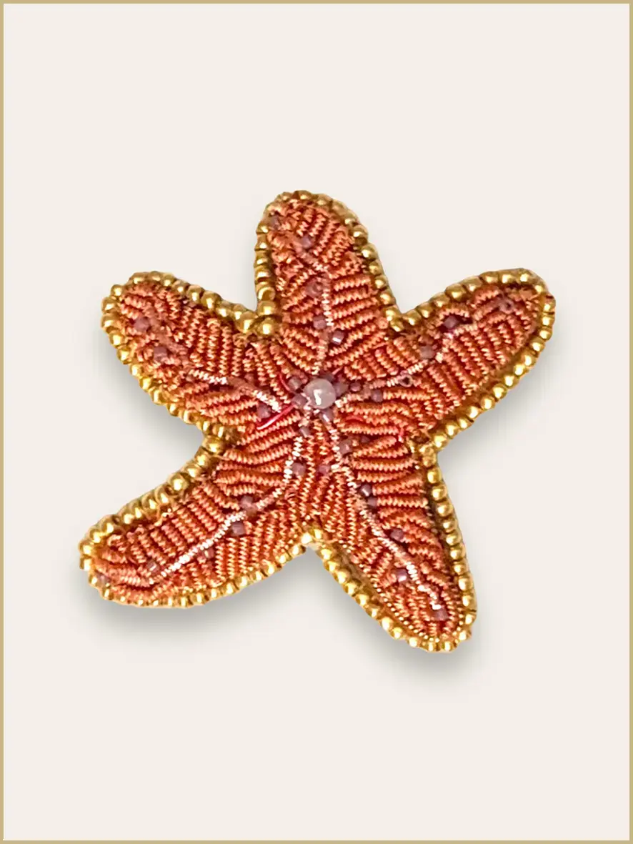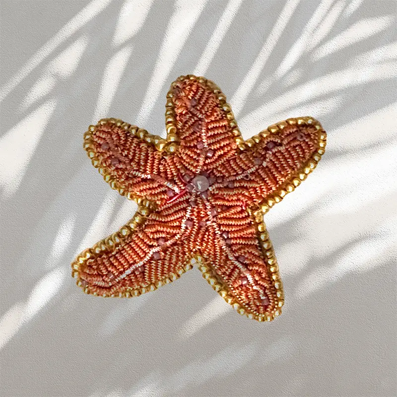 Comme une évocation marine, cette broche brodée en Étoile de mer ira aussi bien sur le revers de votre veste que sur un chapeau ou encore sur un foulard.