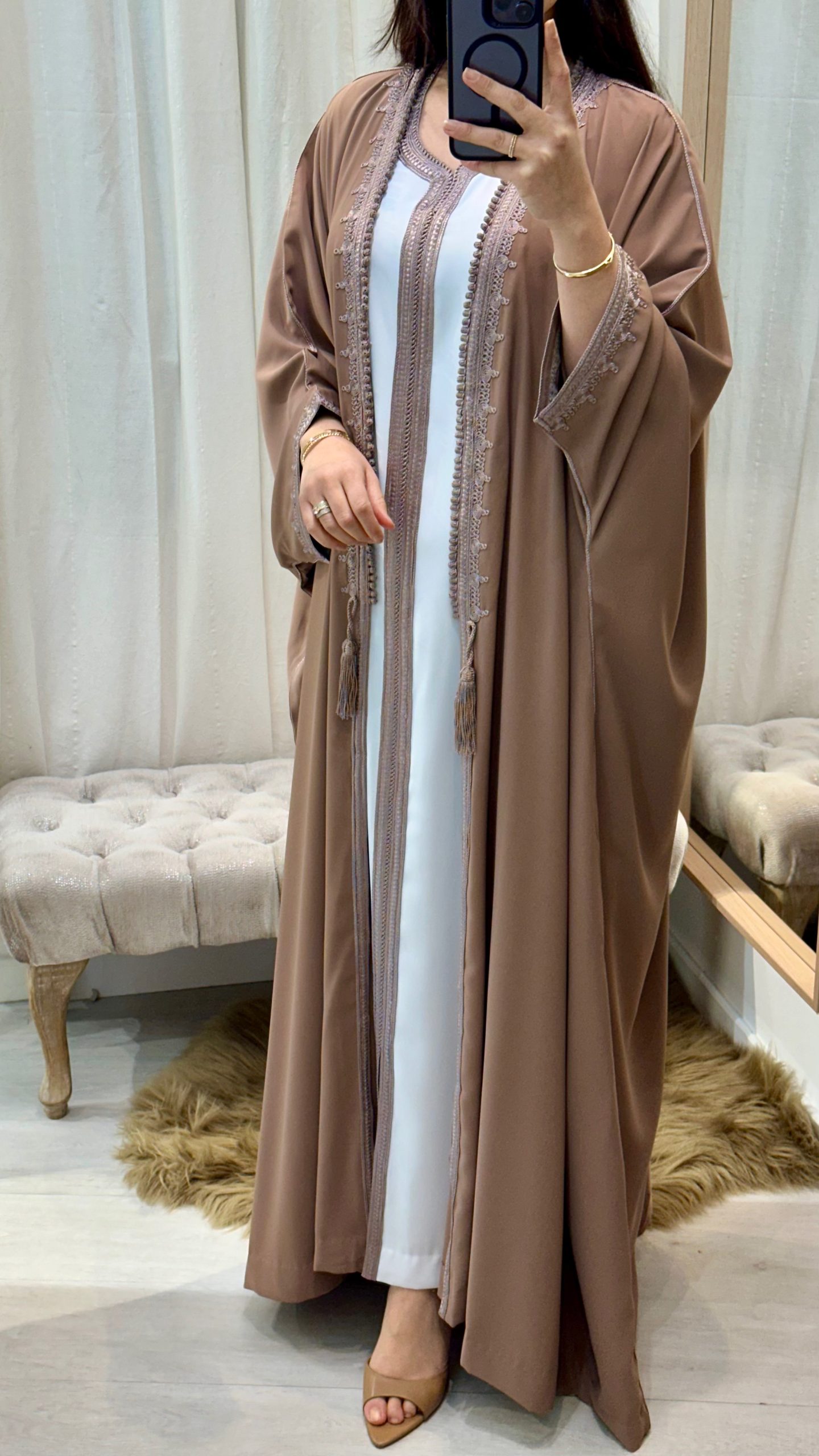 - Caftan très large en taupe rosé avec sfifa/passementerie et deux chouchas devant.