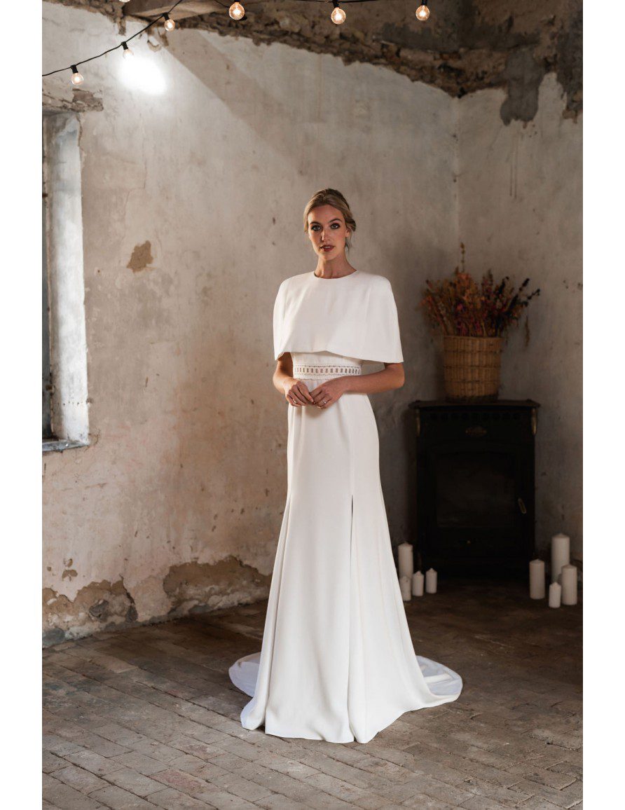 Cape en crêpe rehaussée d’épaulettes et fendue dans le dos. Cette cape au style minimaliste se marie parfaitement avec une robe de mariée à petites manches ou sans manches.