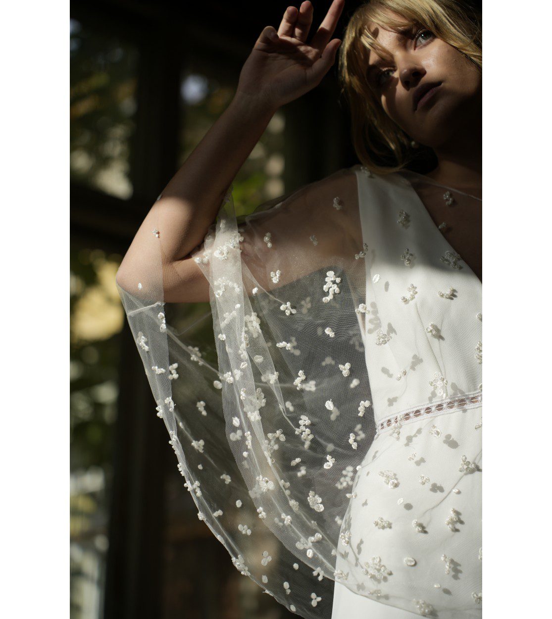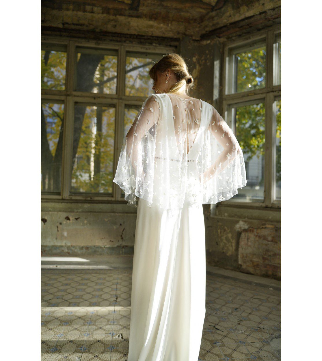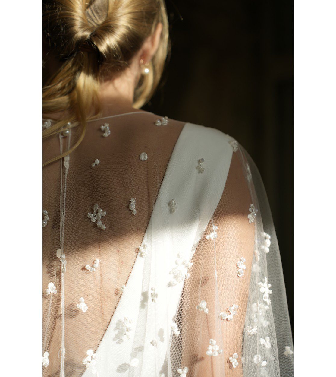 Cape en tulle brodé de perles et de pois, la cape Trésor sublime votre robe de mariée. La cape se pose élegamment sur vos épaules et laisse entrevoir la robe de mariée. Entièrement façonné à la main, le tulle se présente dégressif et chaque pièce est unique.
