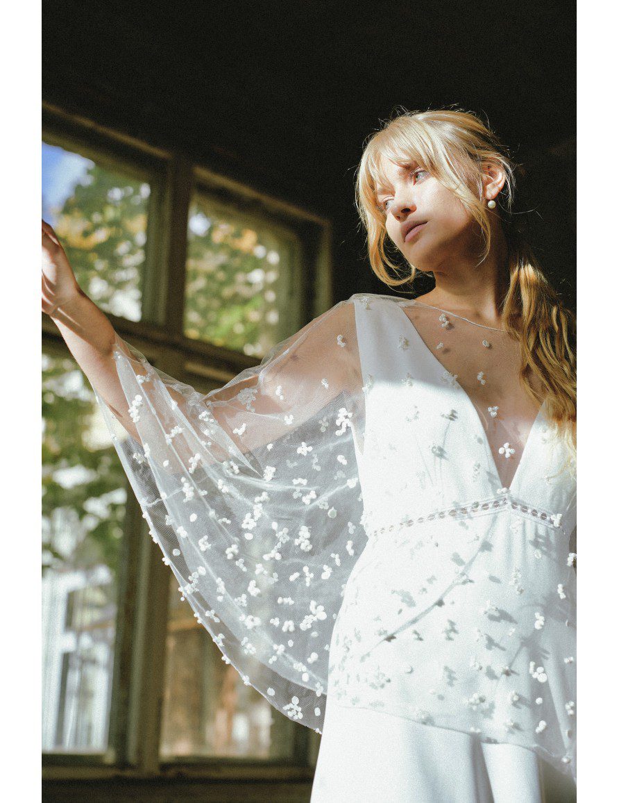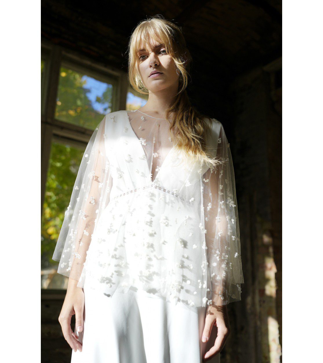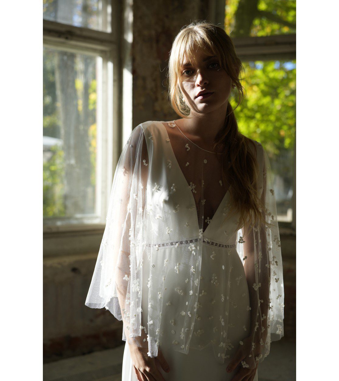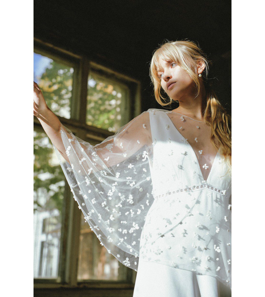 Cape en tulle brodé de perles et de pois, la cape Trésor sublime votre robe de mariée. La cape se pose élegamment sur vos épaules et laisse entrevoir la robe de mariée. Entièrement façonné à la main, le tulle se présente dégressif et chaque pièce est unique.