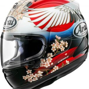 Nous retrouvons la forme caractéristique du jet Guang avec les deux “Cornes de dragon“ présentes de chaque côté du haut du casque, la coque en carbone renforcé héritage des industries aéronautique et spatiale, le jonc chromé ou la bordure cuir parfaitement ajusté, le cuir intérieur soyeux mélangé à la suédine, la fermeture double D et cette fameuse visière fixée par deux belles platines.