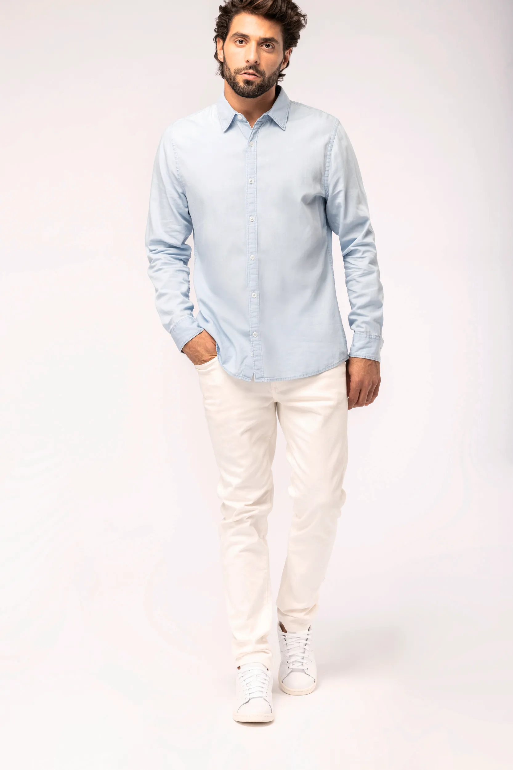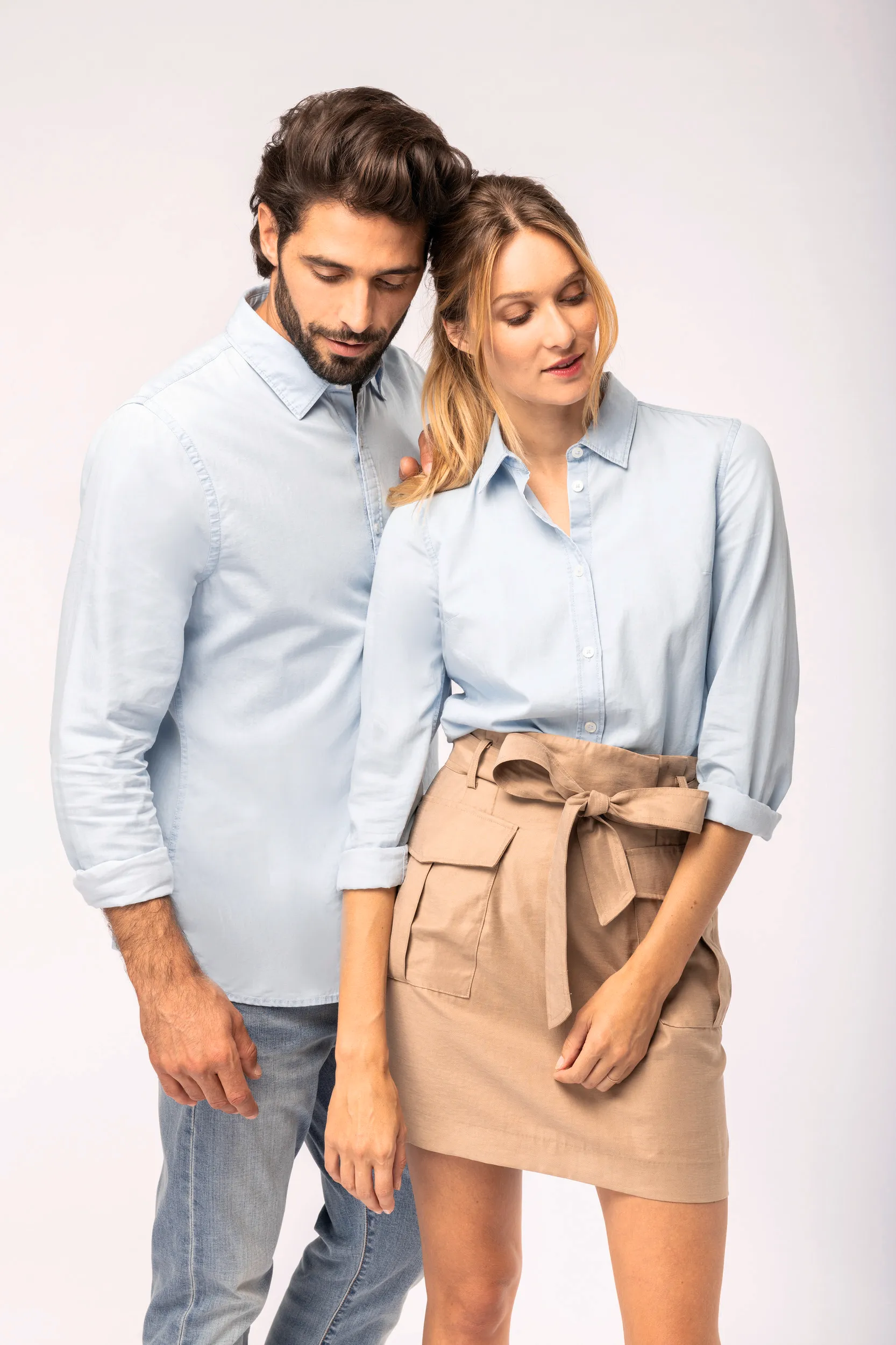 100% coton biologique. Coton peigné. Coupe straight. Patte de boutonnage classique avec boutons effet nacré. Empiècement dos “pli rond” décontracté. Patte de manche en pointe “capucin” boutonnée.