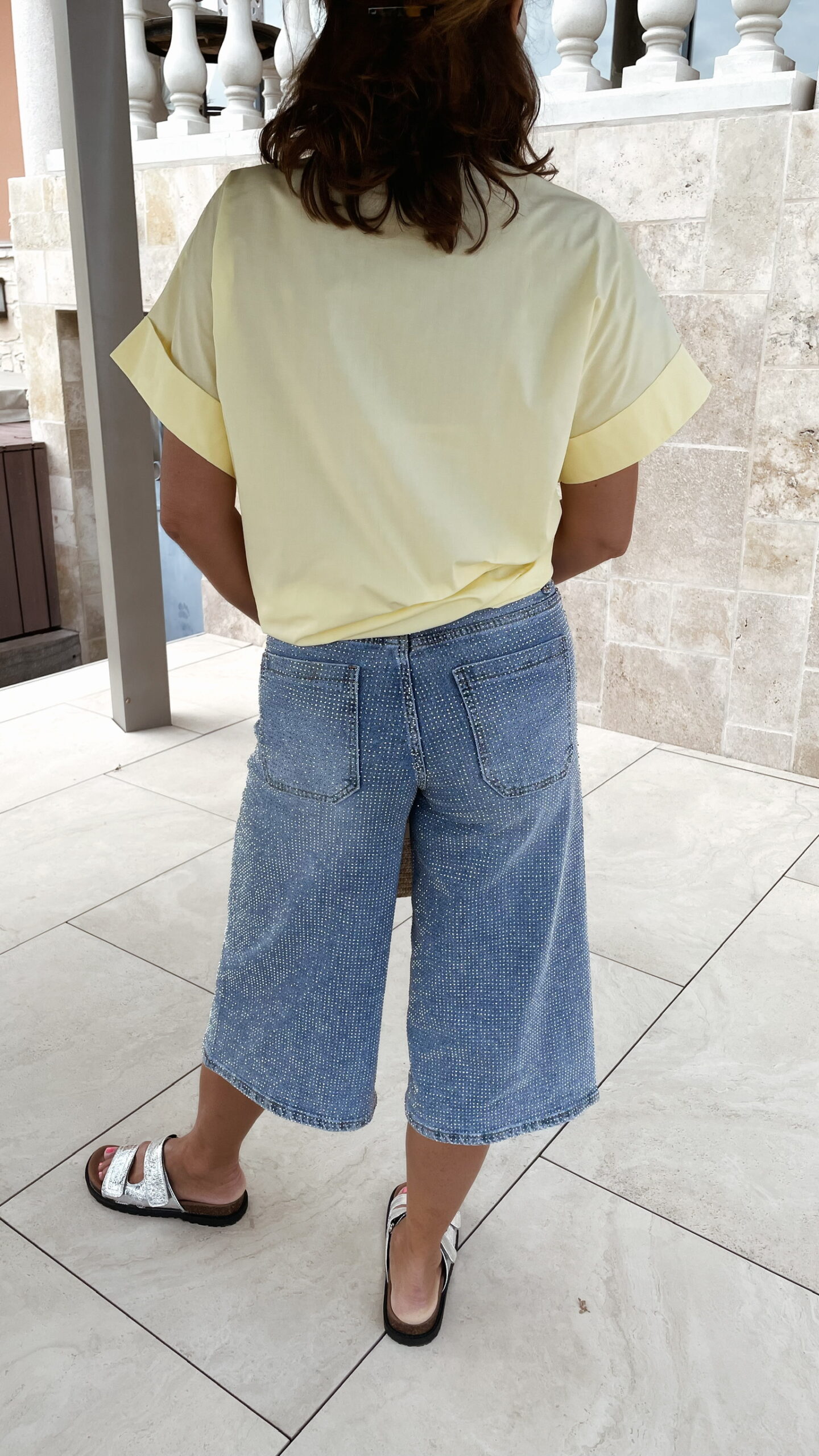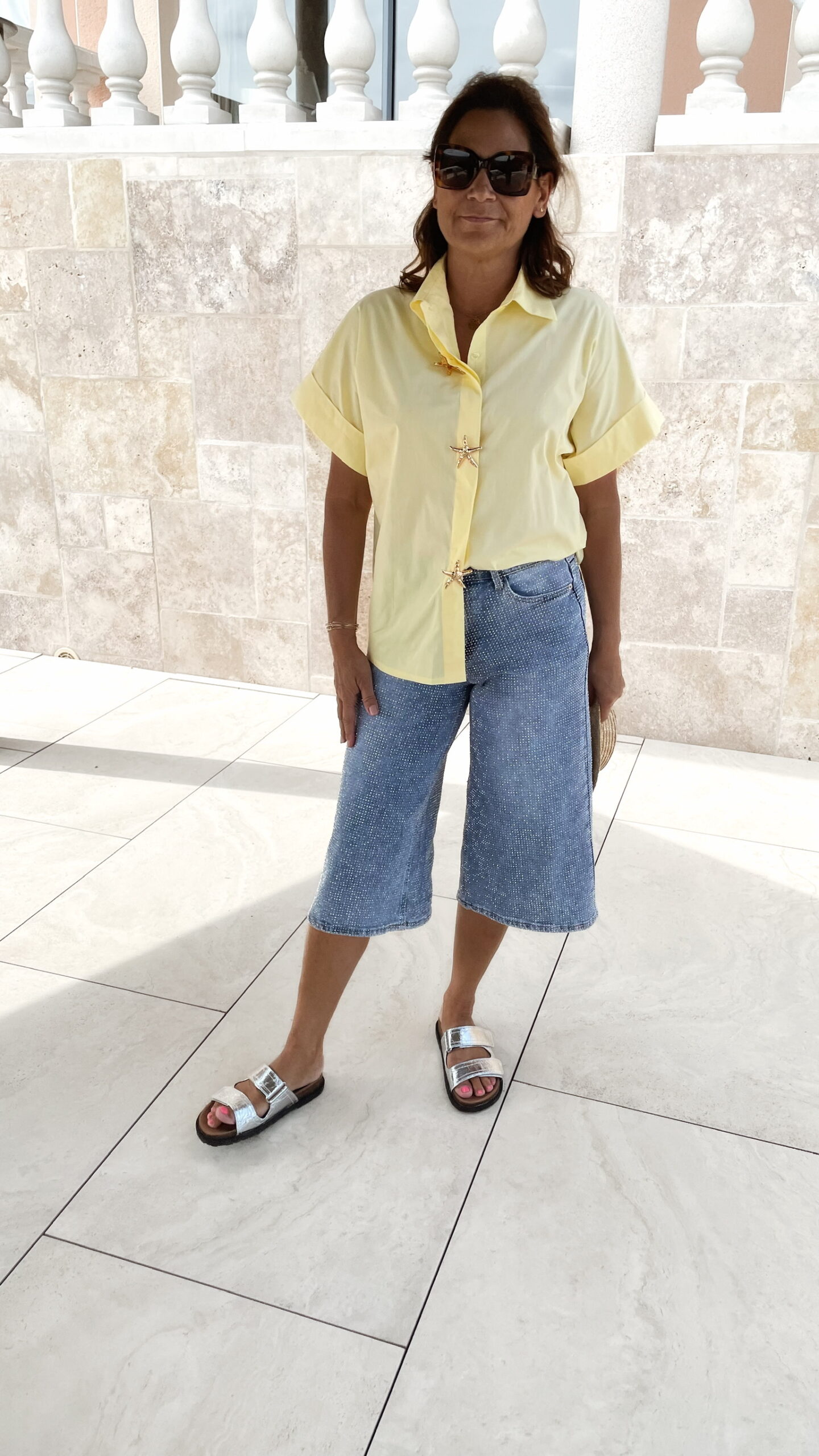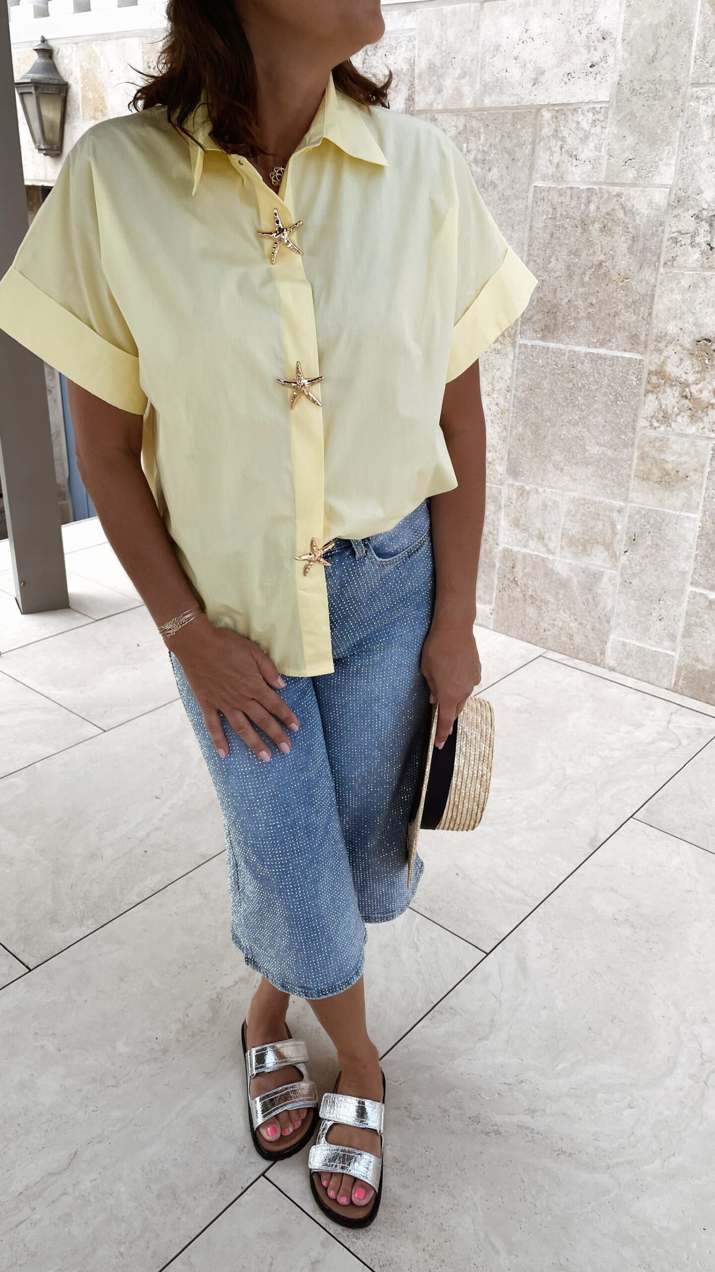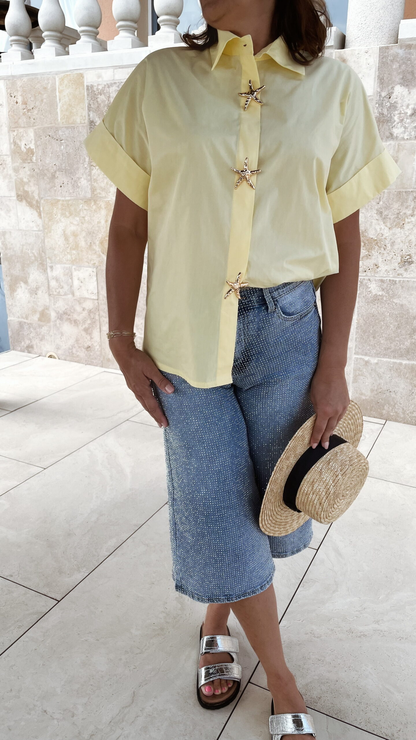 -La chemise LUNA jaune est portée avec le Bermuda Strass.