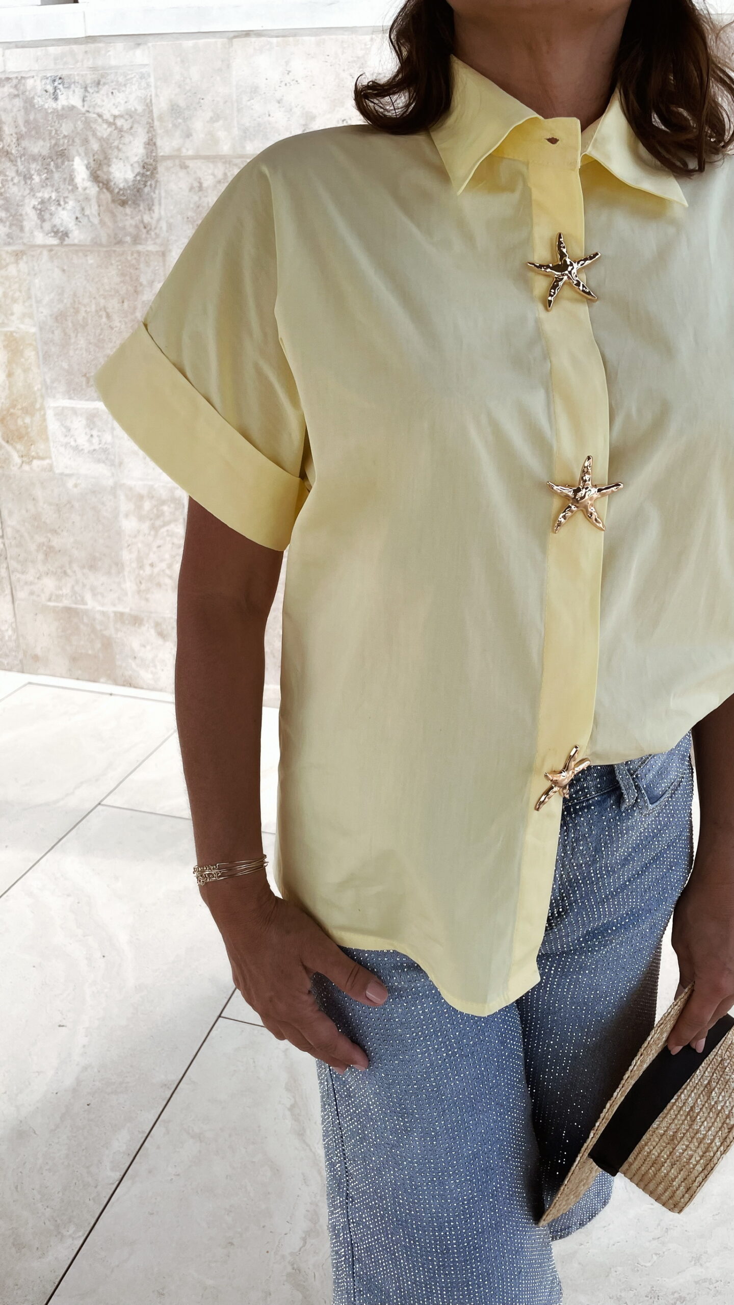 -Chemise à manches courtes jaune avec boutons et broches amovibles étoile dorée.