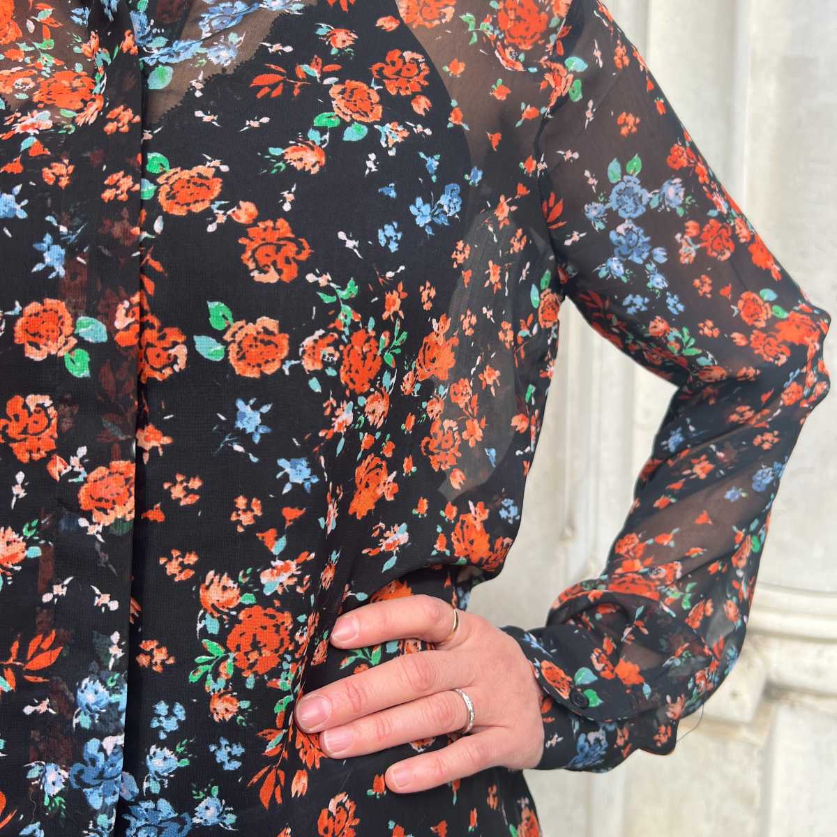 La chemise fleurie en voile peut se porter avec une beau pantalon enduit ou une belle jupe noir. Si vous le souhaitez, mettez un petit débardeur noir en dessous de votre chemise pour moins de transparence !