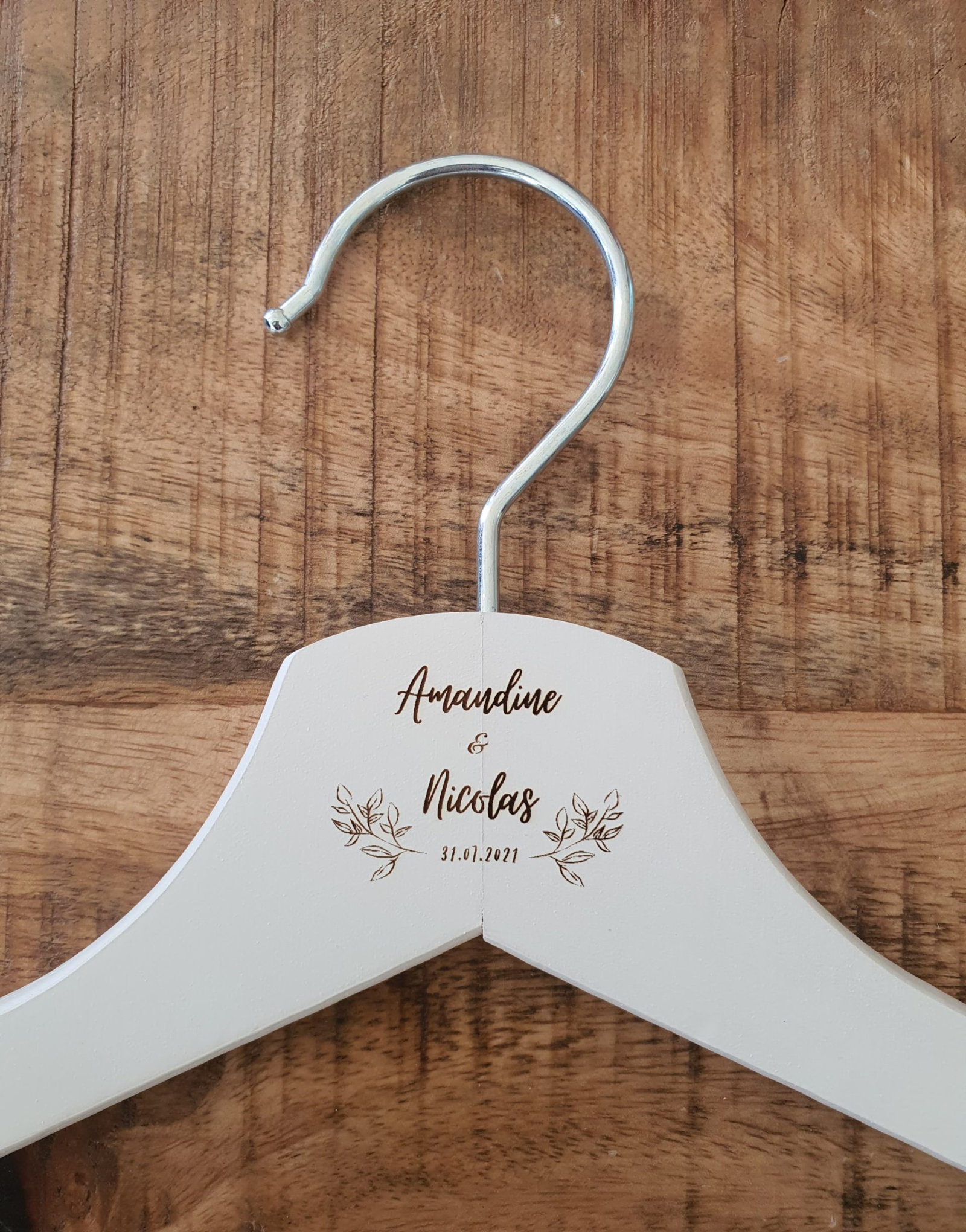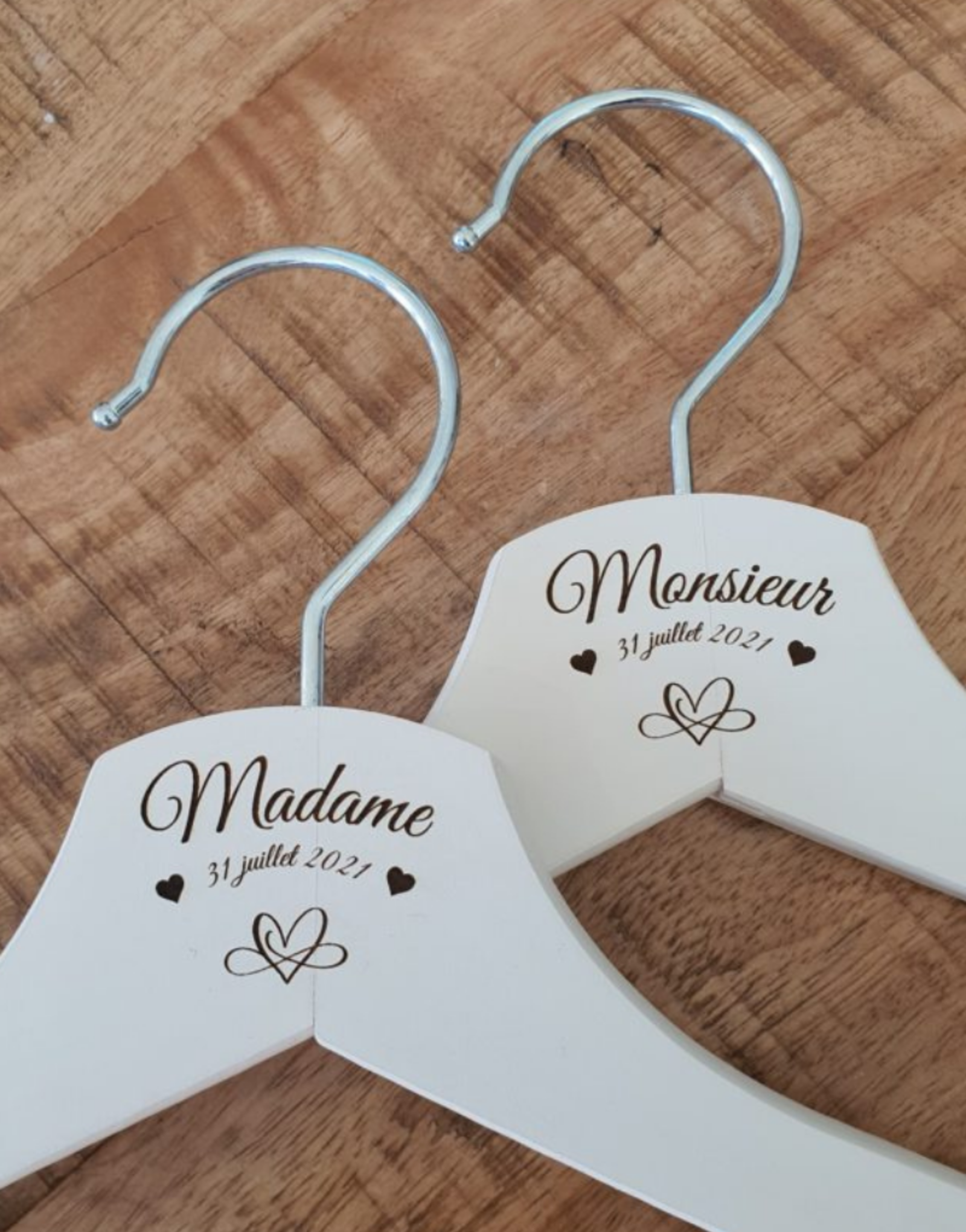 Sublimez vos photos de mariage avec nos cintres en bois personnalisables. Un détail chic et pratique pour mettre en valeur vos tenues nuptiales.