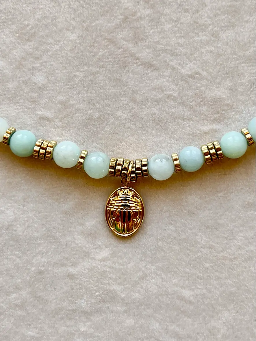 Le pendentif en forme de scarabée doré ajoute une touche de chance et de bonheur à ce bijou intemporel et symbolique.