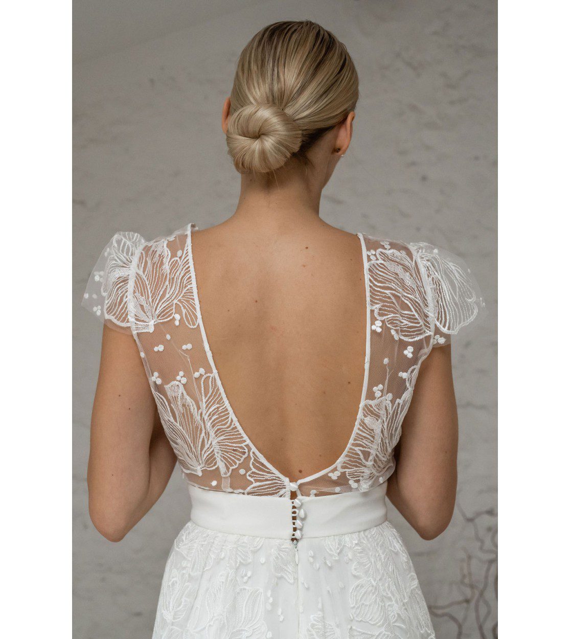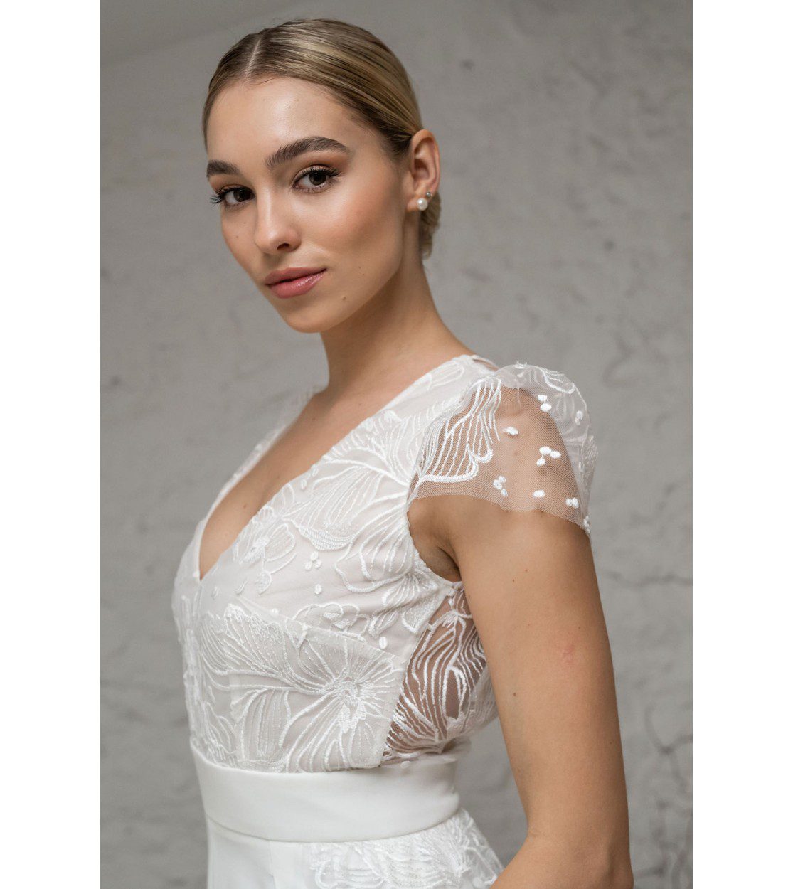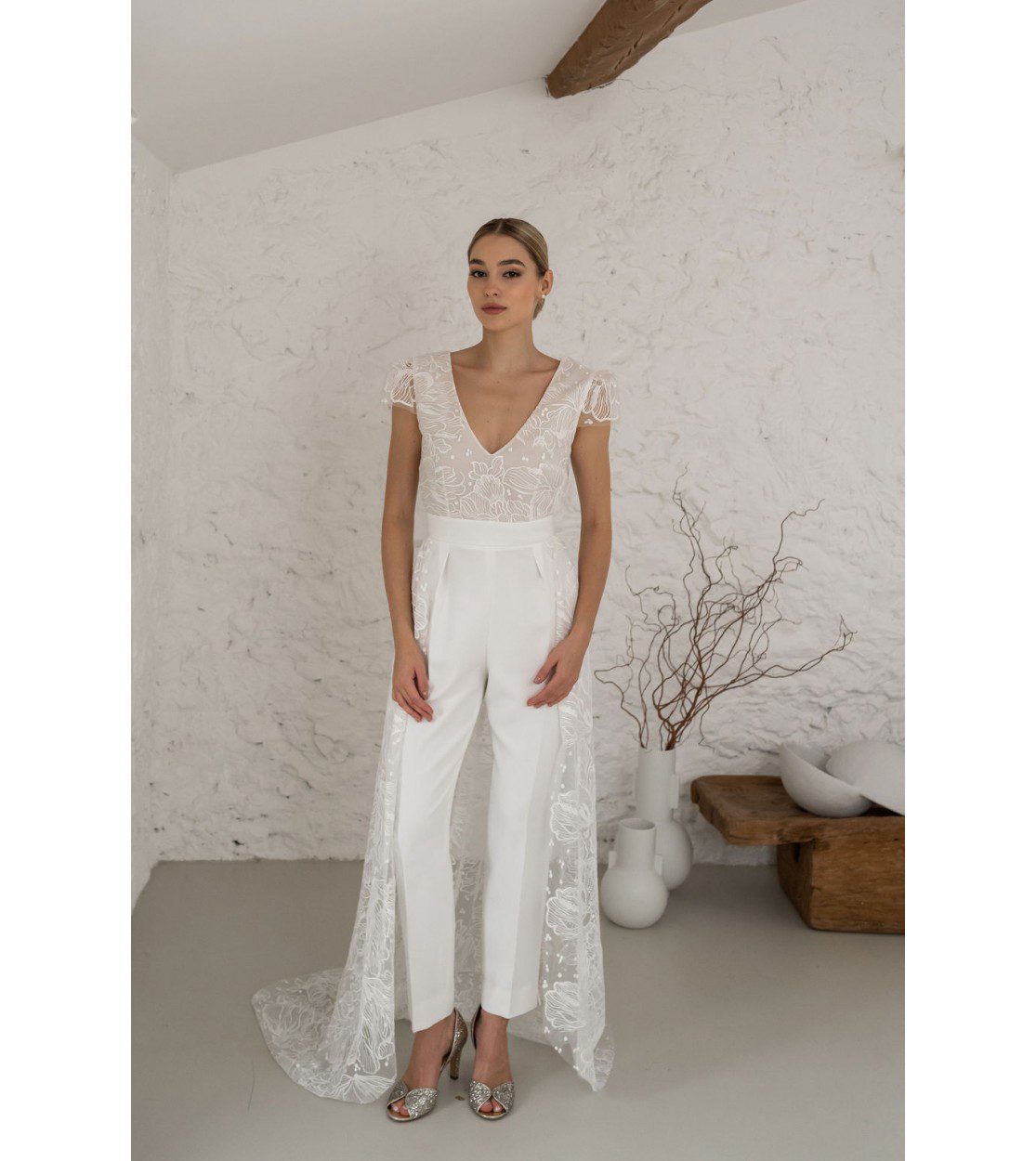 Combinaison mariage pantalon avec traine et à manches courtes. Réalisée en tulle brodé et en crêpe structuré, elle comporte un col V profond et un dos nu. Son pantalon droit est surmonté d’une petite traine en tulle brodé. Son motif à l’esprit floral japonisant est original, c’est la combinaison parfaite pour allier son envie de porter un pantalon et une jupe à traine. Matières principales: Crêpe 77% polyester, 17% rayon 6% élasthanne, Tulle brodé 100% polyester; Doublure opaque 100% polyester