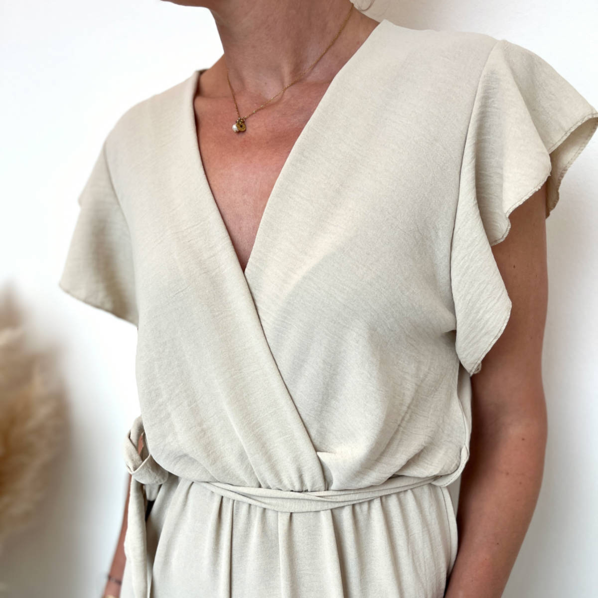 Avec ses manches courtes à volants, son décolleté cache-cœur et sa ceinture dorée à boucle ovale, elle allie charme et confort.